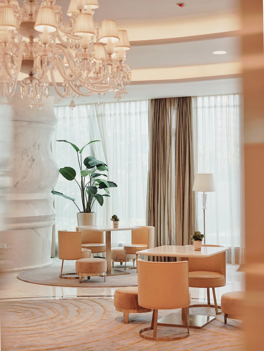 白色基调云石,耀眼水晶灯,简约又华丽的风格。不是我最爱的风格,却明快和敞亮。因为够大,每桌的距离甚远,太适合需要保持social distance的用餐环境。