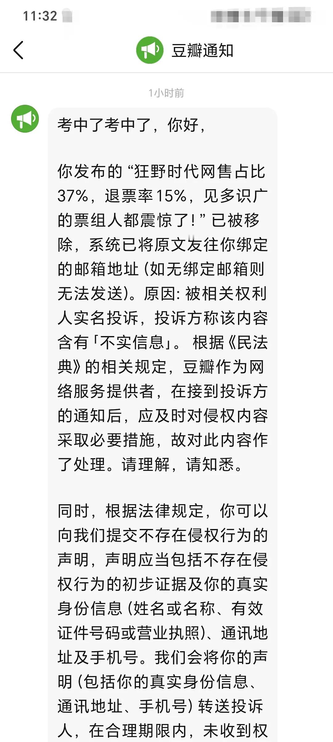 有网友发的“狂野时代退票率”帖子被实名举报投诉删帖了,我想知道是谁举的身份证?是片方还是演员?