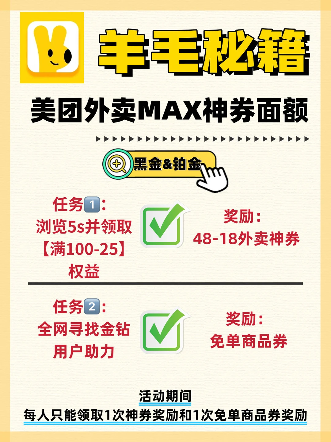 打开美团外卖搜【权益免单】,进会场完成简单任务,就能领免单资格+48-18大额神券!