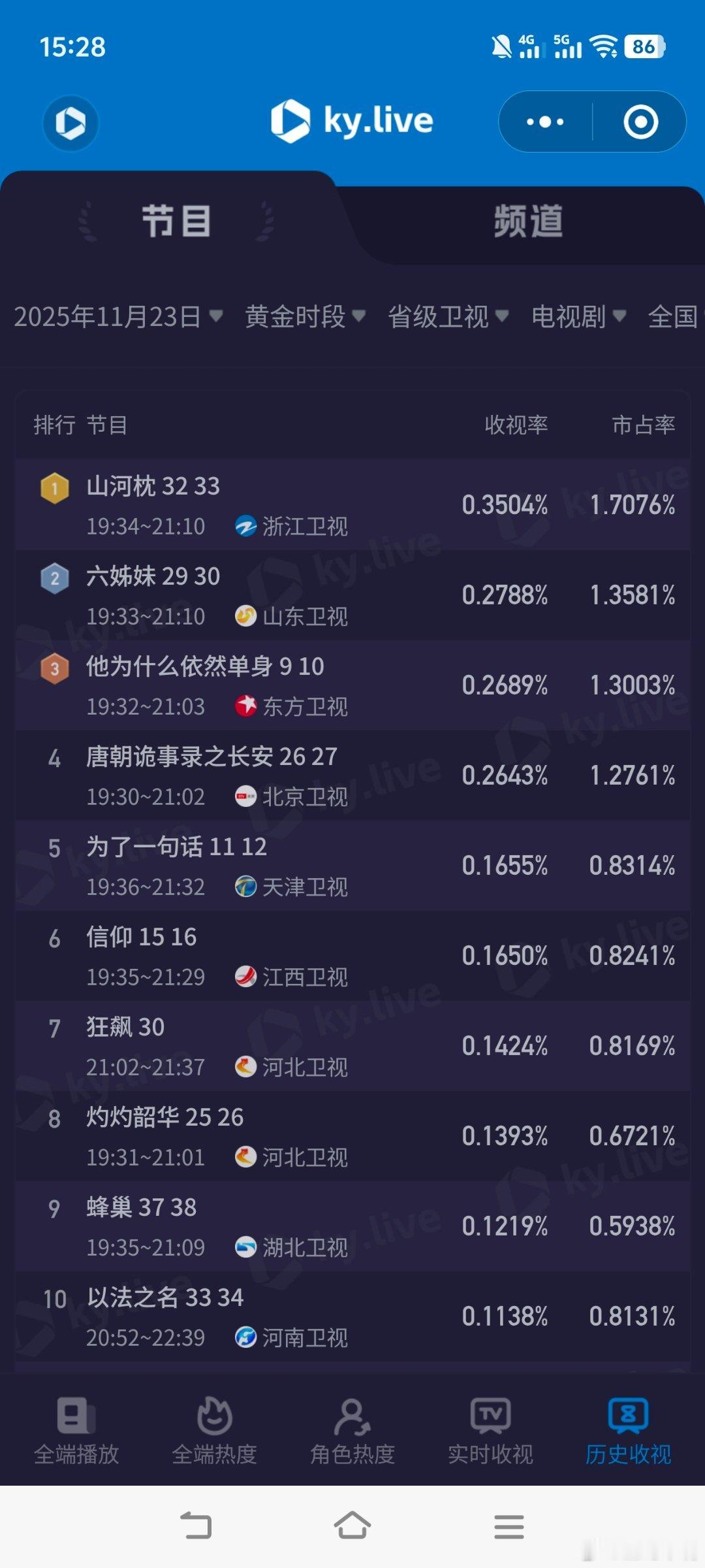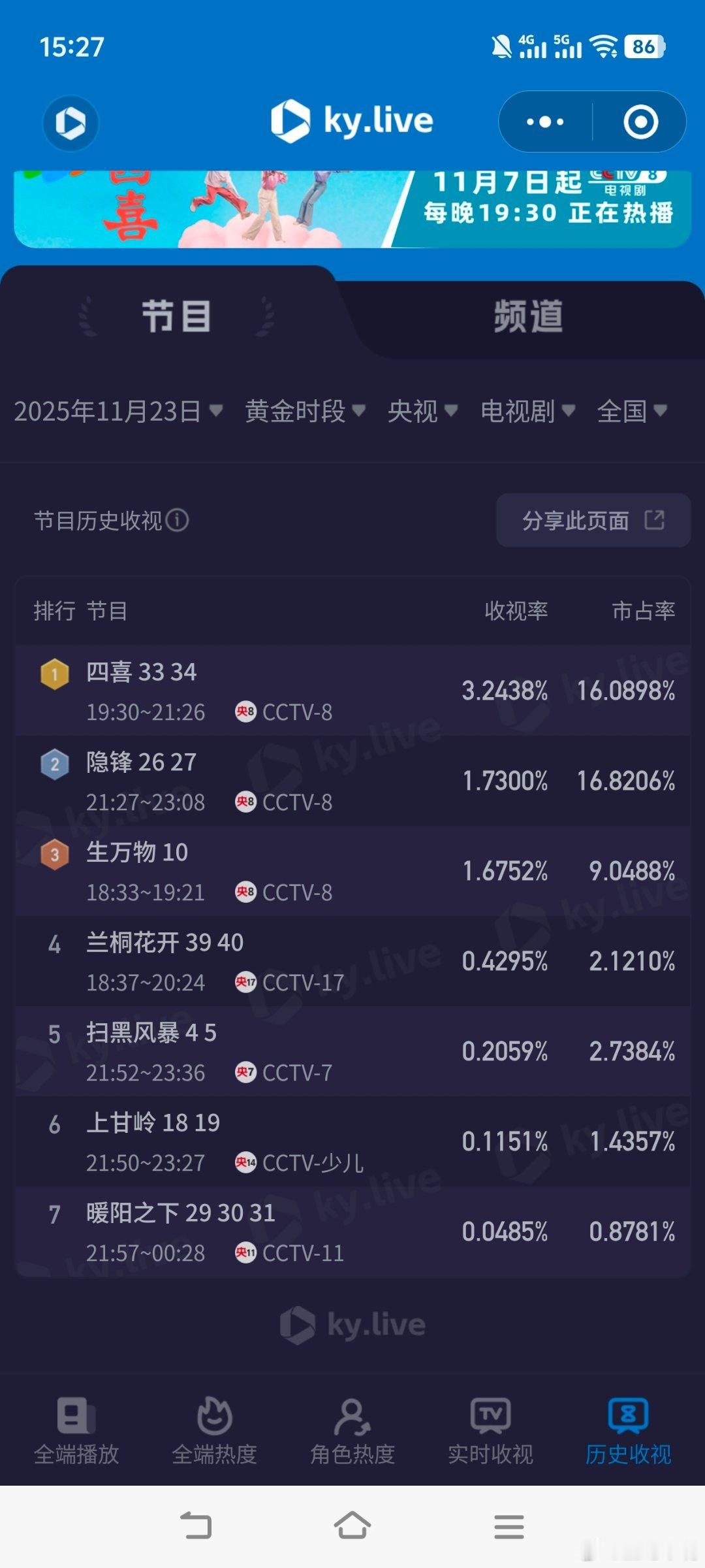 11月23日cvb收视日报四喜2.557,酷云3.2438,系数0.788隐锋1.810,山河枕0.338,酷云0.3504,系数0.965他为什么依然单身0.311,酷云0.2689,系数1.156唐朝诡事录之长安0.243,酷云0.2643,系数0.919