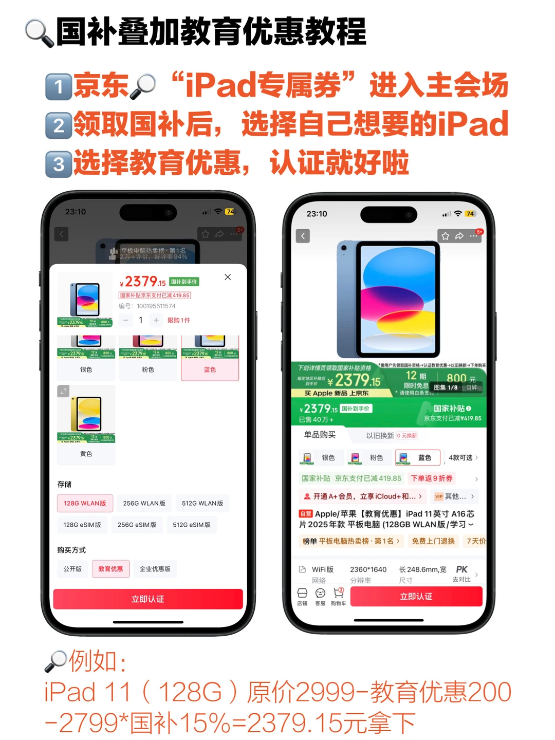 iPad 11 128G,原价2999,京东国补15%➕教育优惠到手2379元