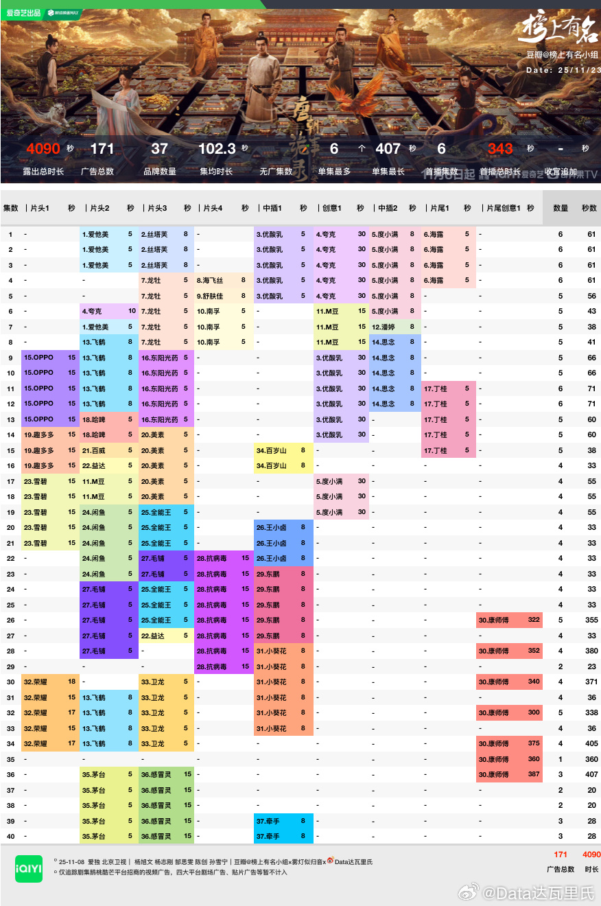 杨旭文、杨志刚 超点当天最高热度10266新高,2025爱奇艺第三招商:视频广告总时长4090s,2025爱奇艺第一,总榜第二