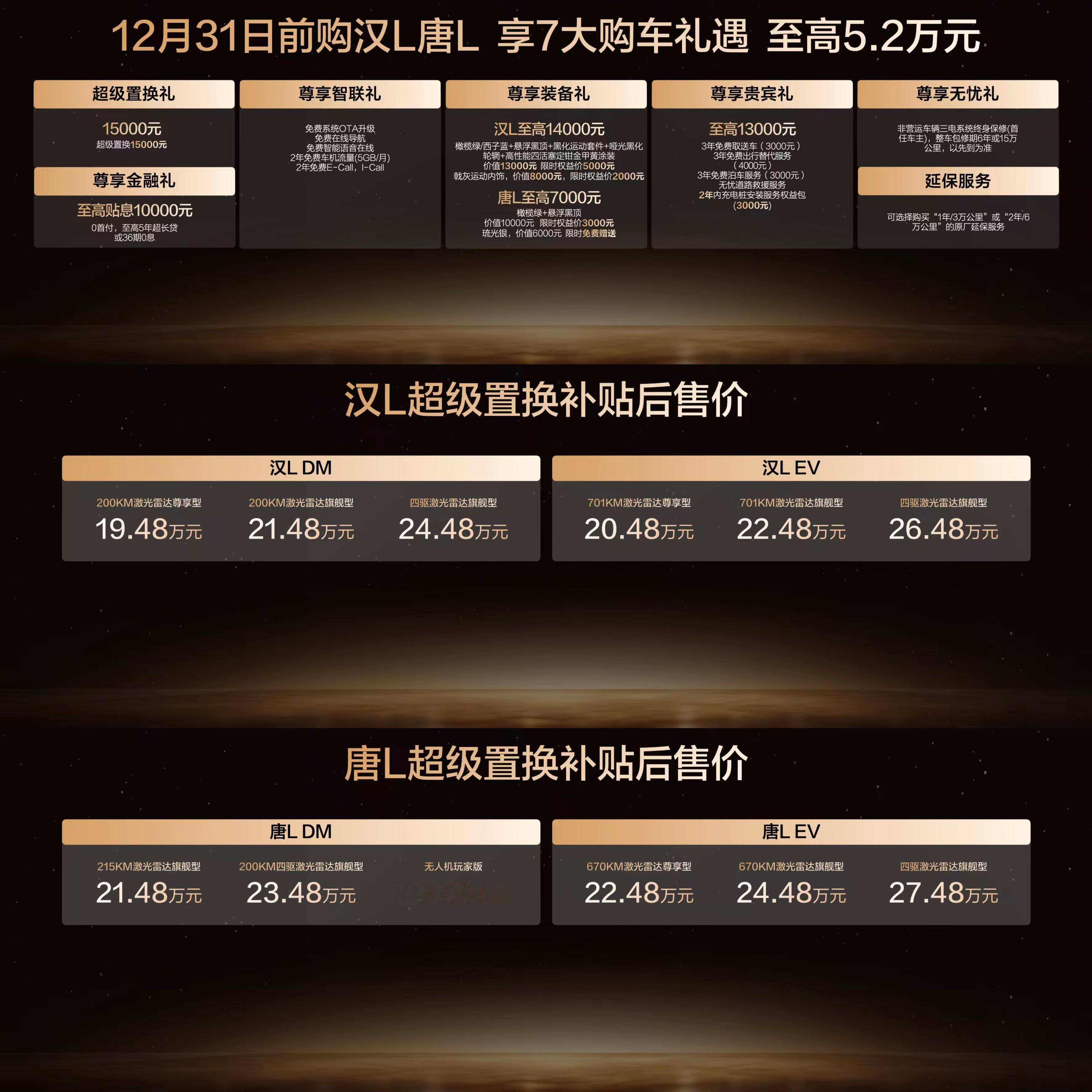 强势来袭!比亚迪汉L唐L新车色搭配OTA升级,超惊喜价格公布!11月21日,比亚迪汉L唐L携新车色与智能OTA震撼登场,瞬间成为车圈焦点。这两款划时代旗舰车型,以全方位的升级,重新定义了中高端旗舰的标准。科技层面,汉L唐L堪称满配。汉L EV、唐L EV全系标配超级e平台,创造了16项全球第一,峰值充电功率高达1000kW,5分钟就能补充400公里续航,让纯电补能焦虑成为过去式。动力性能上,单电机功率高达580kW,四驱版本总马力达1102匹,零百加速最快仅需2.7秒,极速突破300km/h,打破纯电性能天花板。混动版本同样出色,汉L DM、唐L DM搭载第五代DM技术,兼顾超强性能与超级效能,真正实现全场景能耗最优、动力最佳。颜值方面,汉L唐L更是翻倍提升。以Loong Face龙颜美学为基础,推出橄榄绿全新车色,汉L还额外加入西子蓝新色,将东方美学与现代工艺完美融合。橄榄绿绿中透金,在不同光线下呈现不同视觉效果;西子蓝则能随光线变化展现不同色彩,生动还原西湖诗意美感。此外,汉L唐L在智能科技和智慧生态方面也全面进化,带来全新OTA升级,构建起完整的“人×车×家”生态。科技满配颜值翻倍,比亚迪汉L唐L以超强实力,彻底打破中高端旗舰的技术天花板,打造出全面超越期待的梦想座驾,为新时代出行提供了完美答案。现在订购,还能享受丰厚限时权益,值得推荐!