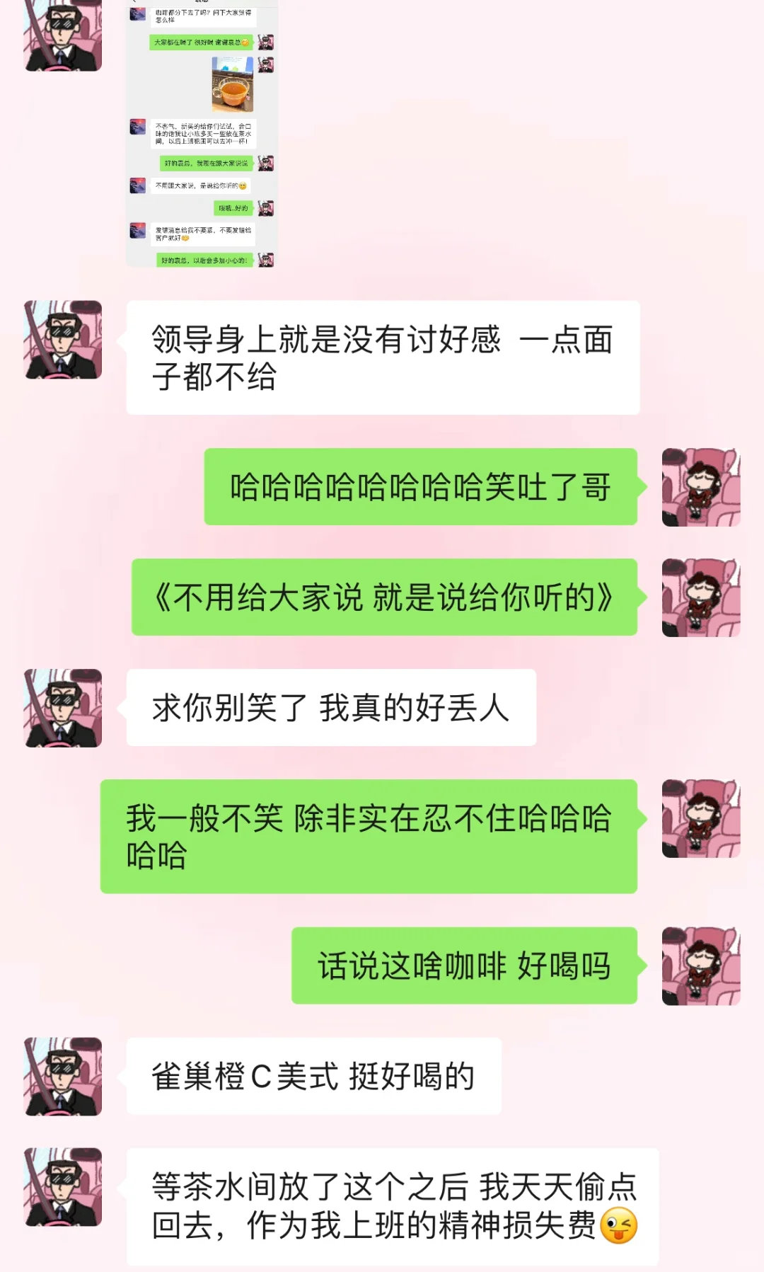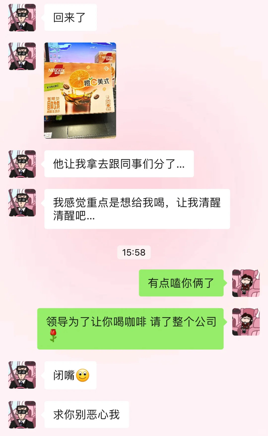 谁懂啊!男朋友上班困到神志不清,把给我发的‘老婆看看你’直接甩给领导了!领导回‘不在我这’,他当场脚趾抠出三室一厅!清醒后领导让他拿两盒雀巢橙C美式,他以为全公司福利,结果领导补刀‘不用跟大家说,我是说给你听的’!现在他天天趁茶水间没人偷咖啡,说是‘精神损失费’,我偷喝了一包,橙子味美式超清爽,VC+提神双buff,领导买的果然不亏!