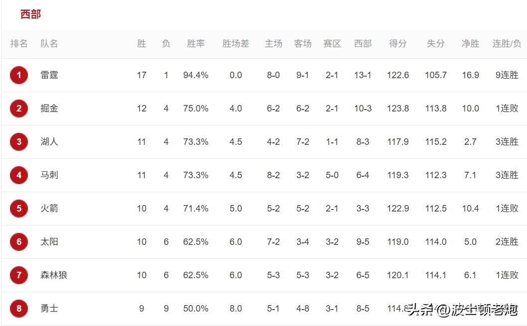 罕见,东部5成胜率以上的球队竟然比西部多。更罕见的是东部第一是活塞,东部第二是猛龙,只想问一句,今夕是何年? 虽然本赛季只进行了五分之一,但是季后赛格局已初见端倪,东部那边11支球队争8个季后赛席位,西部那边9支球队争8个季后赛席位,这和赛季开始之前大家预测的完全不一样[捂脸]今年NBA真的邪门。