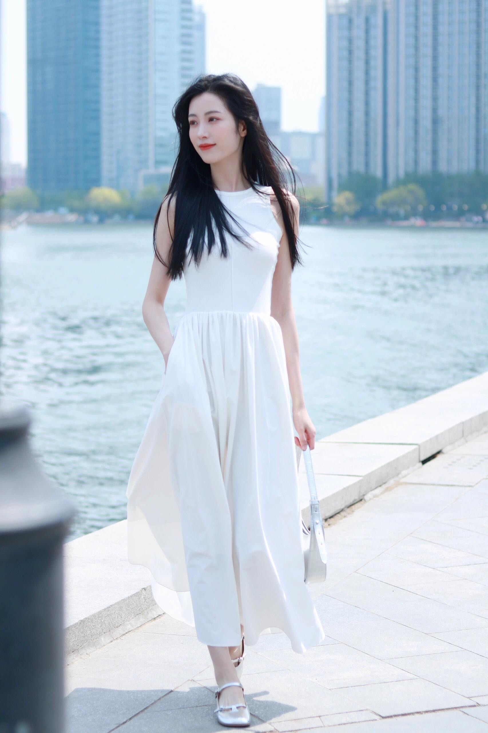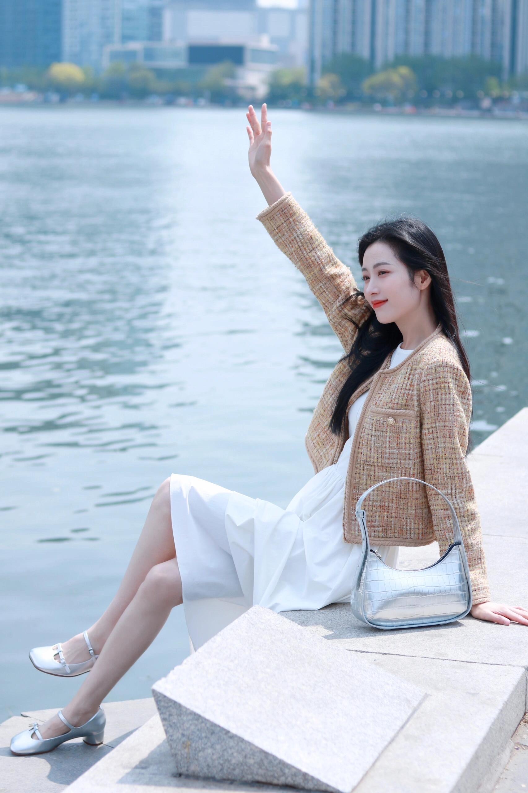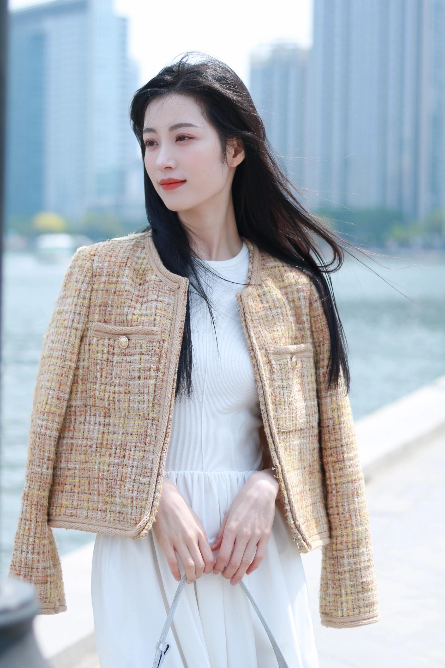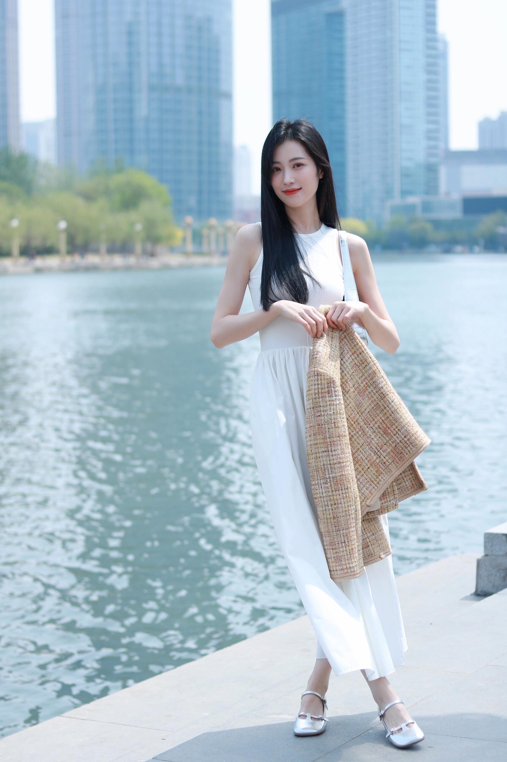 都市风穿搭,优雅白裙搭配格纹外套,尽显时尚与气质!