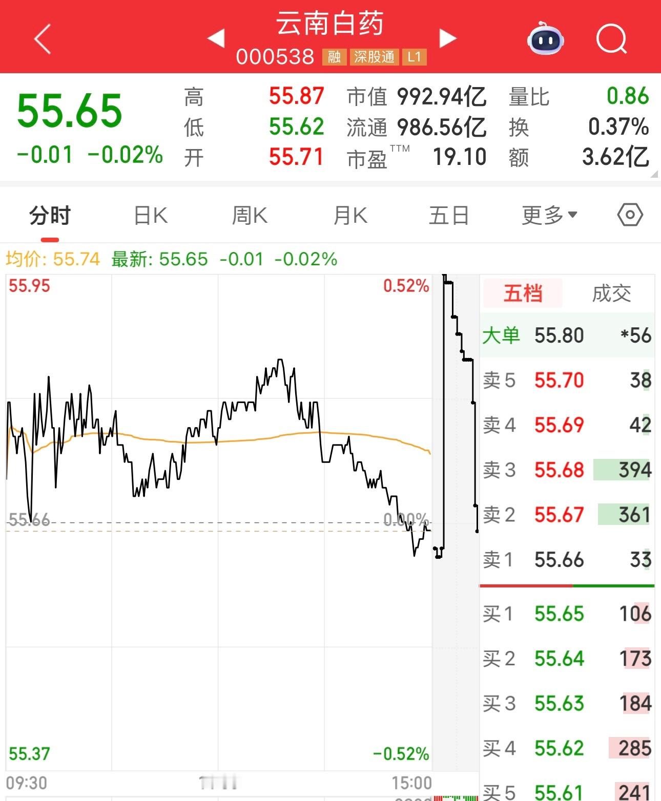 上午10点时,上证指数和创业板绿了时,老登股当时是涨的。五粮液当时股价还向上冲了下,我还高兴了会,想着,难道今天五粮液要大涨了?茅台那会也是涨的。但后面一个个绿油油。云南白药的股价更是气人,全天都是上涨的,但收盘时,绿了。