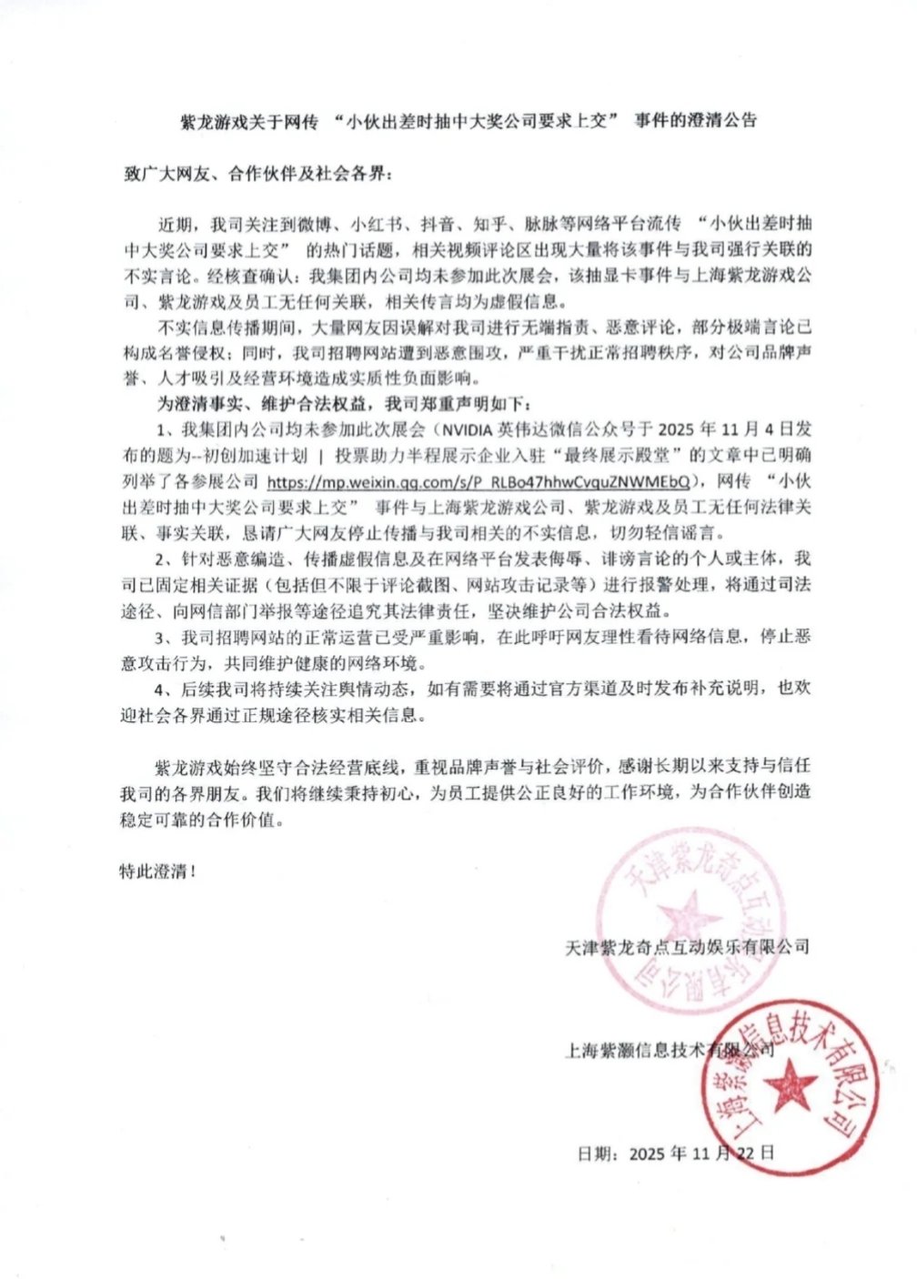 11月22日,紫龙游戏上海研发中心发布了澄清公告,公开回应此事。公告中称,近期,该公司关注到网络平台流传“小伙出差时抽中大奖公司要求上交”的热门话题,相关视频评论区出现大量将该事件与该公司强行关联的不实言论。经核查确认:该集团内公司均未参加此次展会,该抽显卡事件与上海紫龙游戏公司、紫龙游戏及员工无任何关联,相关传言均为虚假信息。