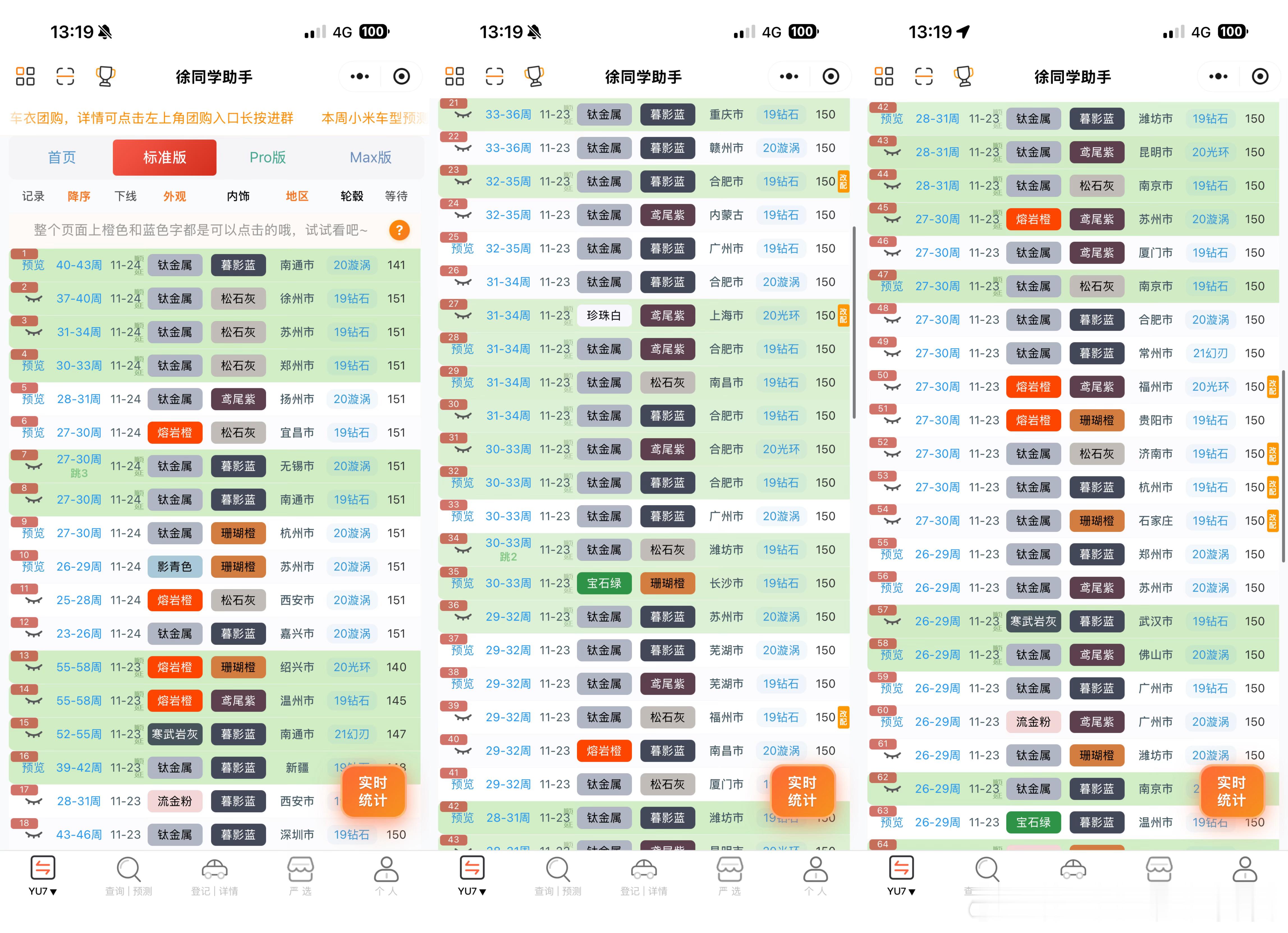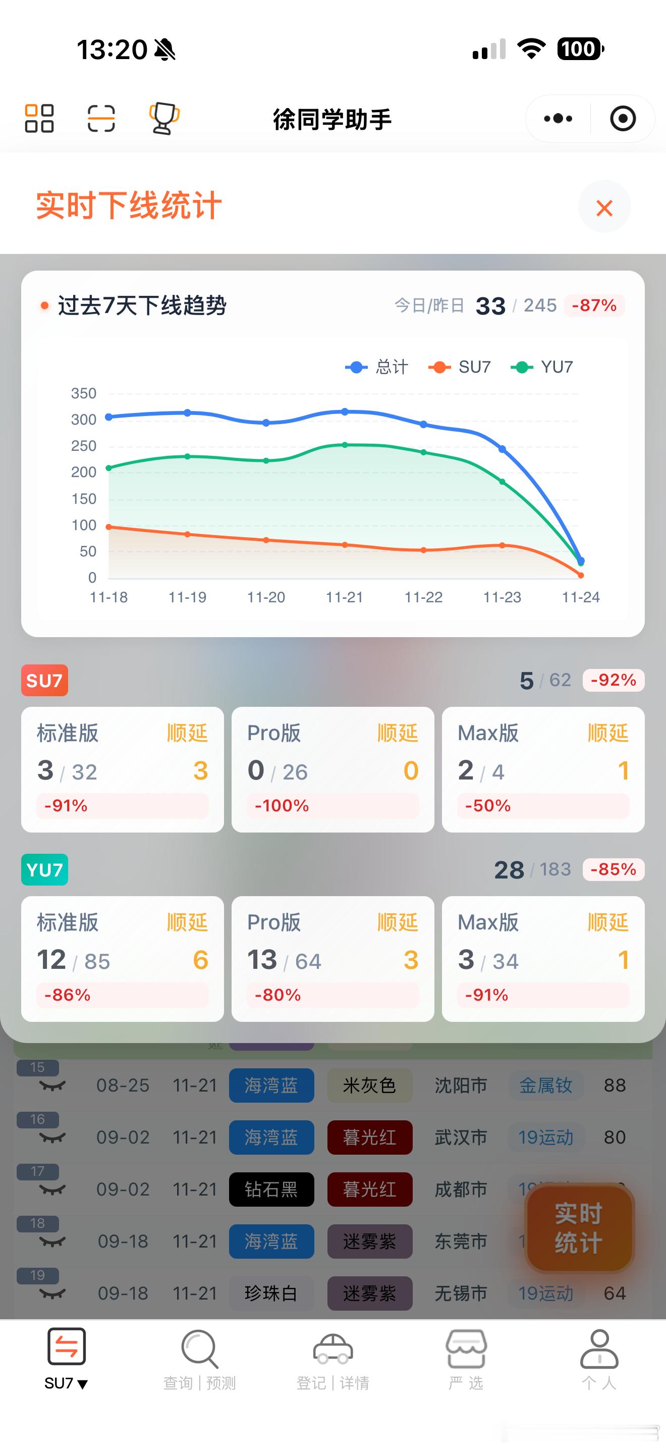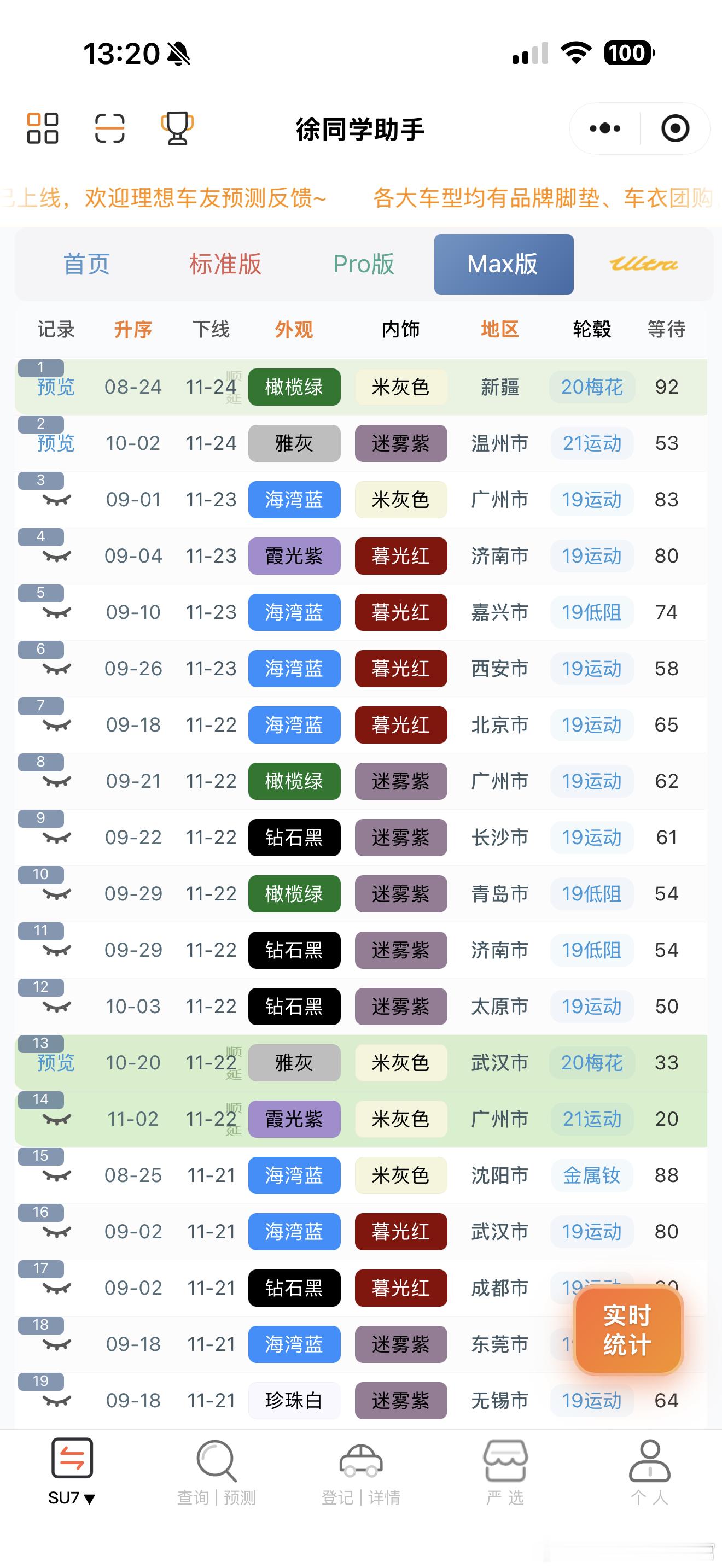 小米汽车(11月24日)下线实况‼️‼️又跳周了!小米SU7新锁单又跳了两周,其中pro和max版本现在下定仅需4-7周即可下线提车,即买即提不再是梦了~📈当然,也是因为要改款了,所剩订单数量确实不多月底冲刺要开始了~🌀YU7(据不完全统计)合计183台1️⃣标准:下线85台,大部队26-27周,还有一部分23-25周的在陆续交付,贵州过去了很多订单,包括不限于小米品牌,补贴估计坚持不了太久,相应的下线也尤其慢2️⃣Pro:下线64台,正常大部队26-28周,极少数24周左右的留下来垫底了3️⃣Max:下线34台,大部队28-30周,基本都是稀有色(据观察,光换轮毂确实会比较快)🌀SU7(据不完全统计)合计62 台1️⃣标准:下线32台,大部队6-8月,180多天以上的基本都是北京的2️⃣Pro:下线26台,7-10月的随时可下。新锁单一个月内提车,今年的订单都能在今年内交付完成3️⃣Max:下线4台,基本没啥订单了,即买即交付,新增订单也很少,都在等新款了4️⃣ultra:无‼️月底顺延多起来了,有机会大幅度提前下线!更多关于小米汽车的最新资讯和深度解析,请参考【米车派】~