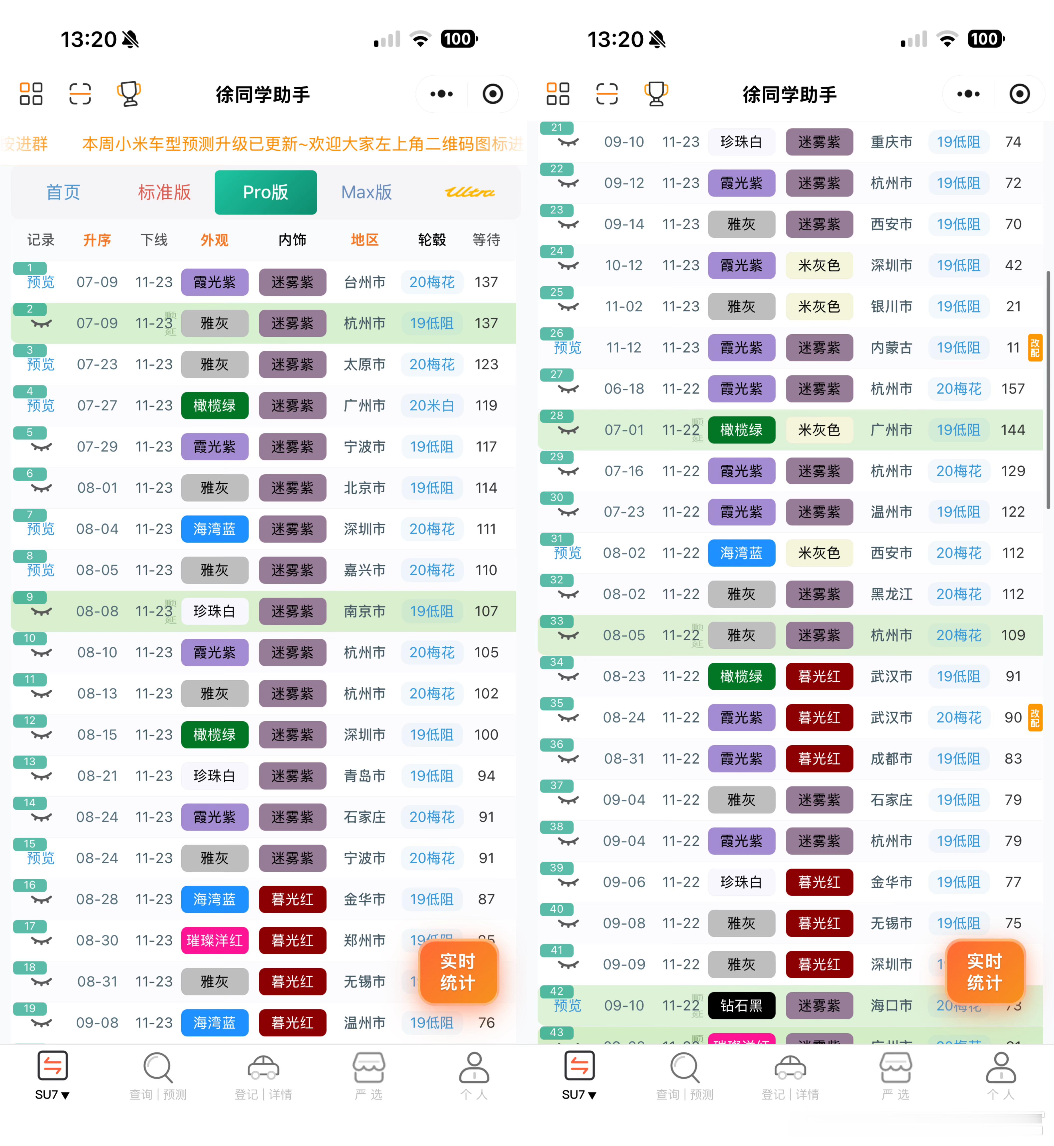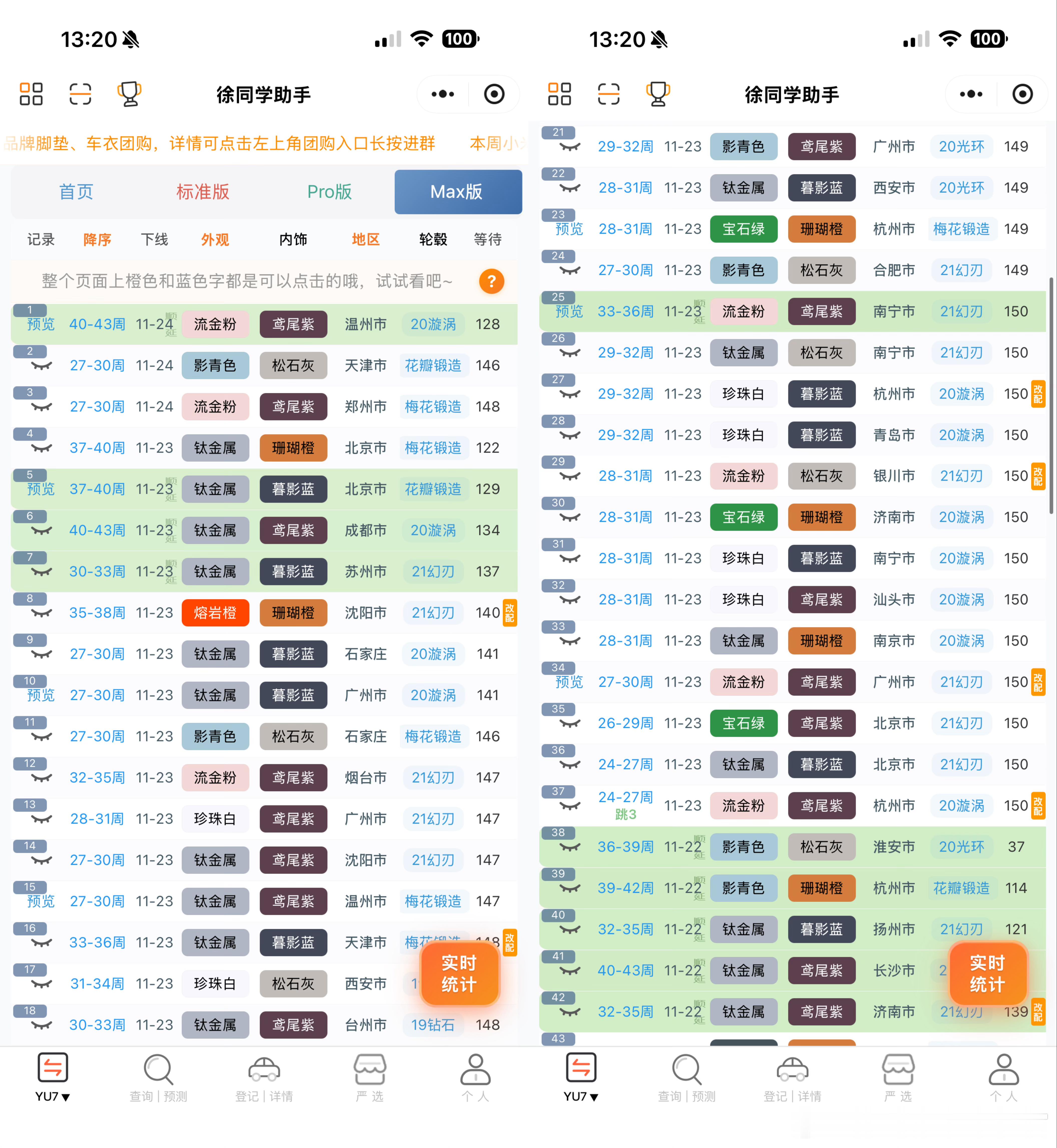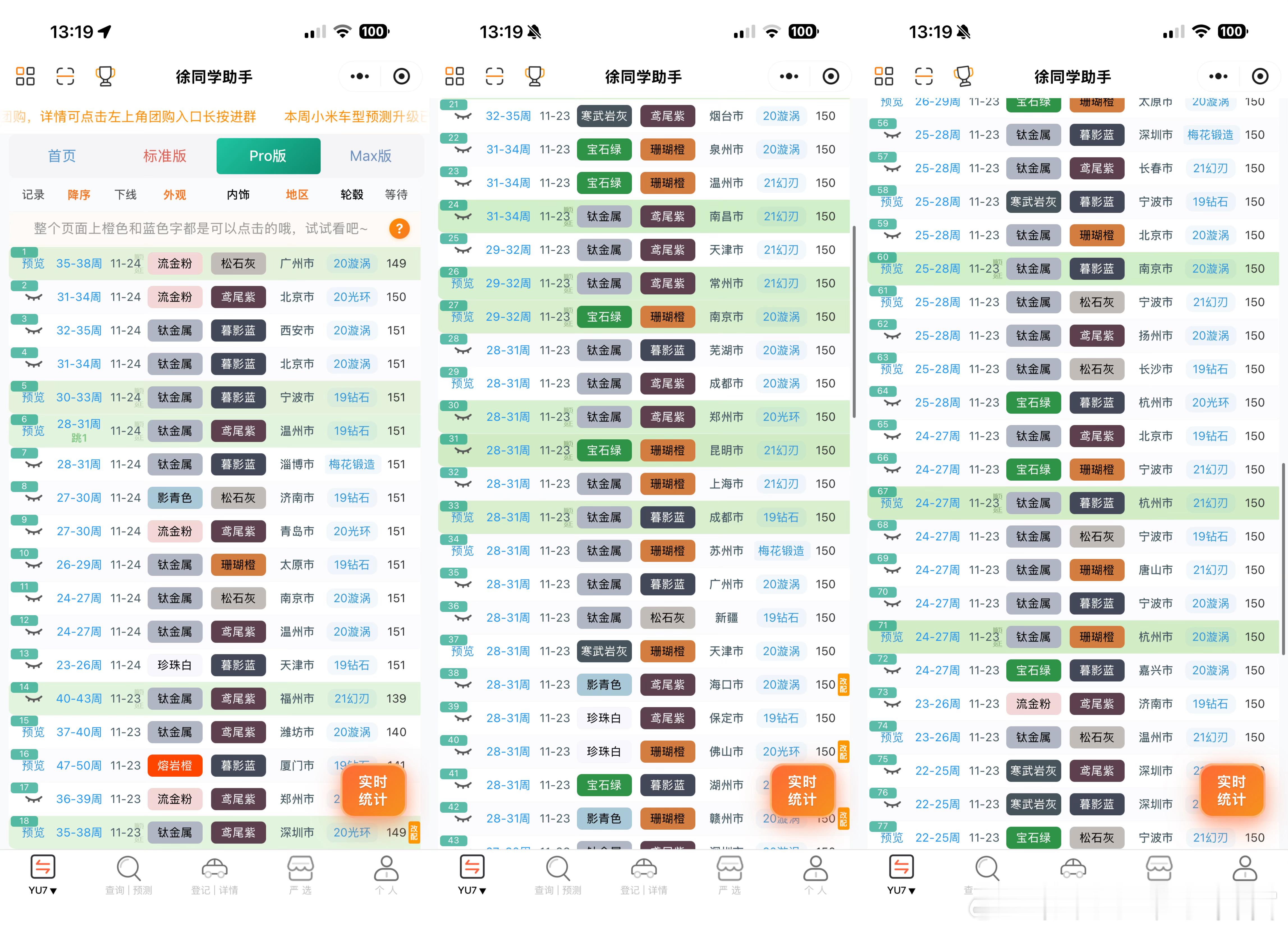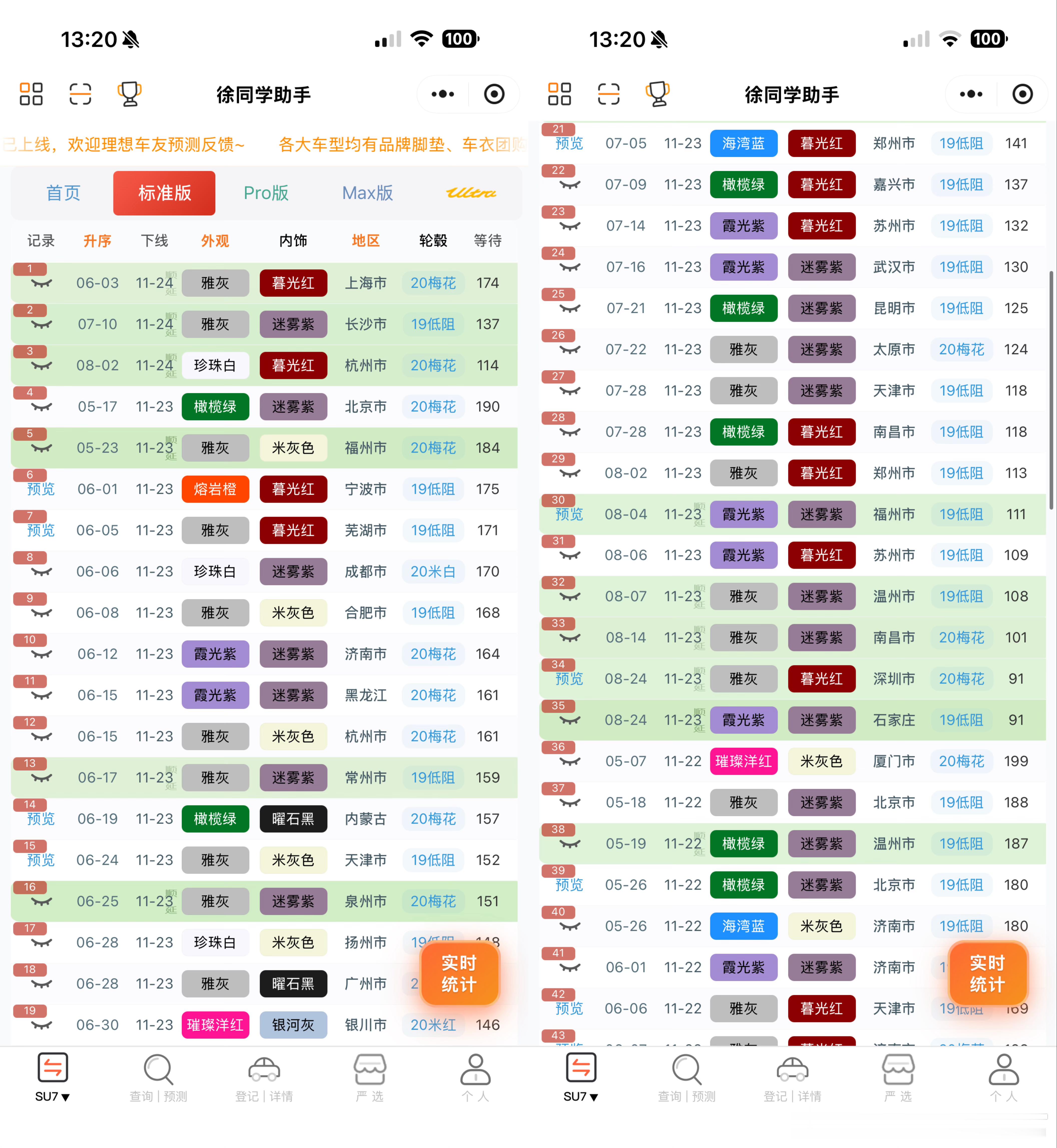 小米汽车(11月24日)下线实况‼️‼️又跳周了!小米SU7新锁单又跳了两周,其中pro和max版本现在下定仅需4-7周即可下线提车,即买即提不再是梦了~📈当然,也是因为要改款了,所剩订单数量确实不多月底冲刺要开始了~🌀YU7(据不完全统计)合计183台1️⃣标准:下线85台,大部队26-27周,还有一部分23-25周的在陆续交付,贵州过去了很多订单,包括不限于小米品牌,补贴估计坚持不了太久,相应的下线也尤其慢2️⃣Pro:下线64台,正常大部队26-28周,极少数24周左右的留下来垫底了3️⃣Max:下线34台,大部队28-30周,基本都是稀有色(据观察,光换轮毂确实会比较快)🌀SU7(据不完全统计)合计62 台1️⃣标准:下线32台,大部队6-8月,180多天以上的基本都是北京的2️⃣Pro:下线26台,7-10月的随时可下。新锁单一个月内提车,今年的订单都能在今年内交付完成3️⃣Max:下线4台,基本没啥订单了,即买即交付,新增订单也很少,都在等新款了4️⃣ultra:无‼️月底顺延多起来了,有机会大幅度提前下线!更多关于小米汽车的最新资讯和深度解析,请参考【米车派】~