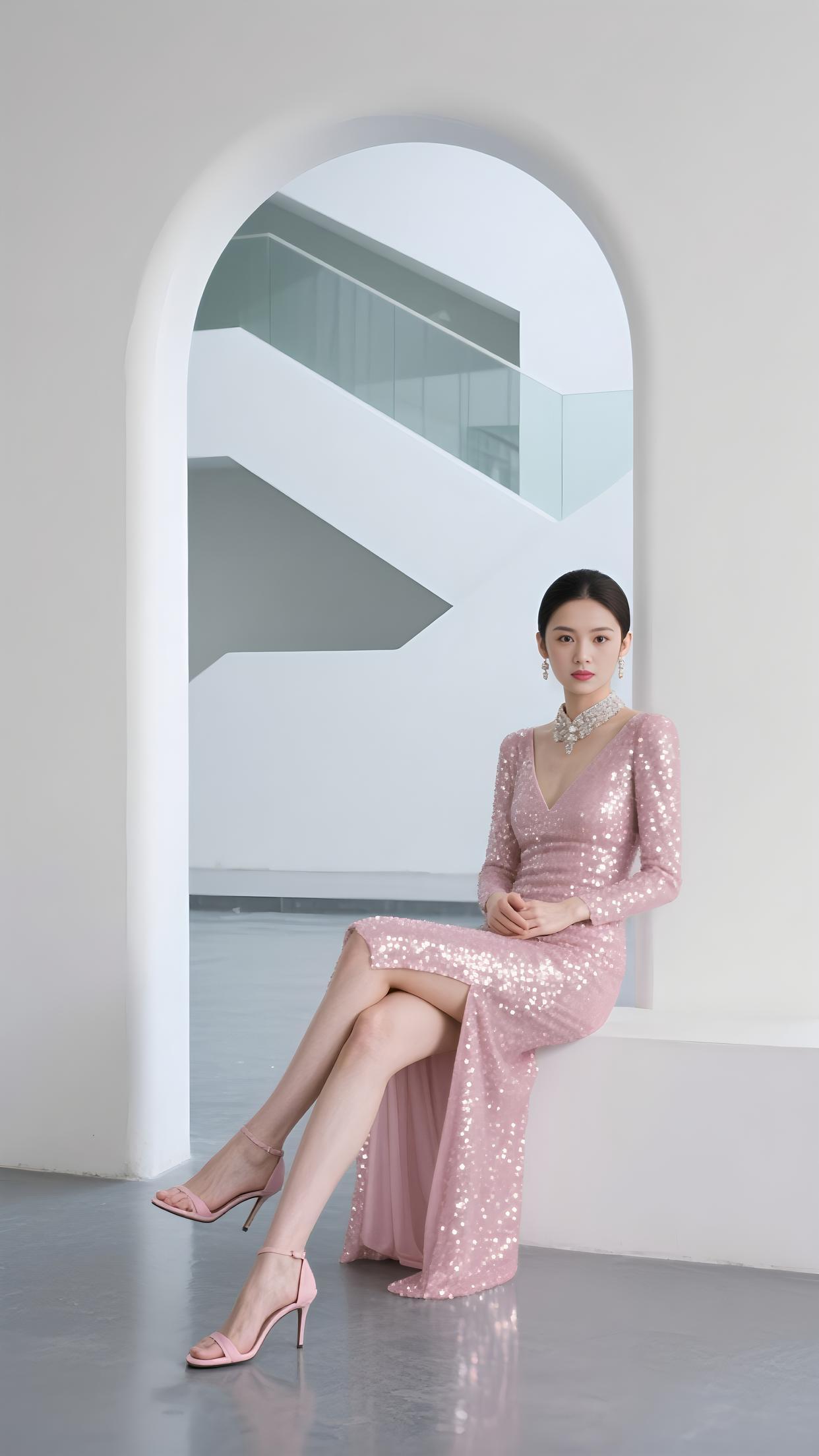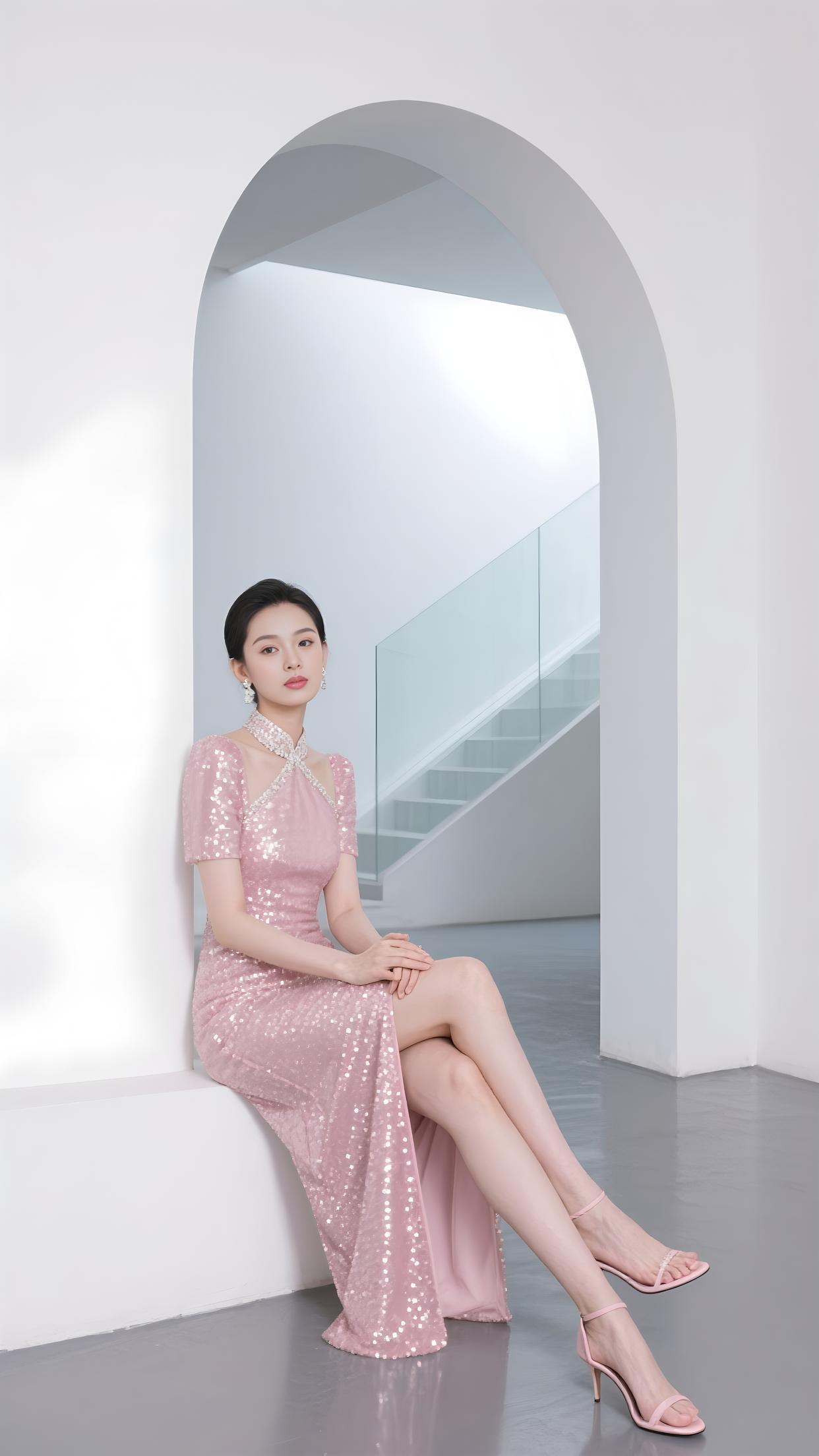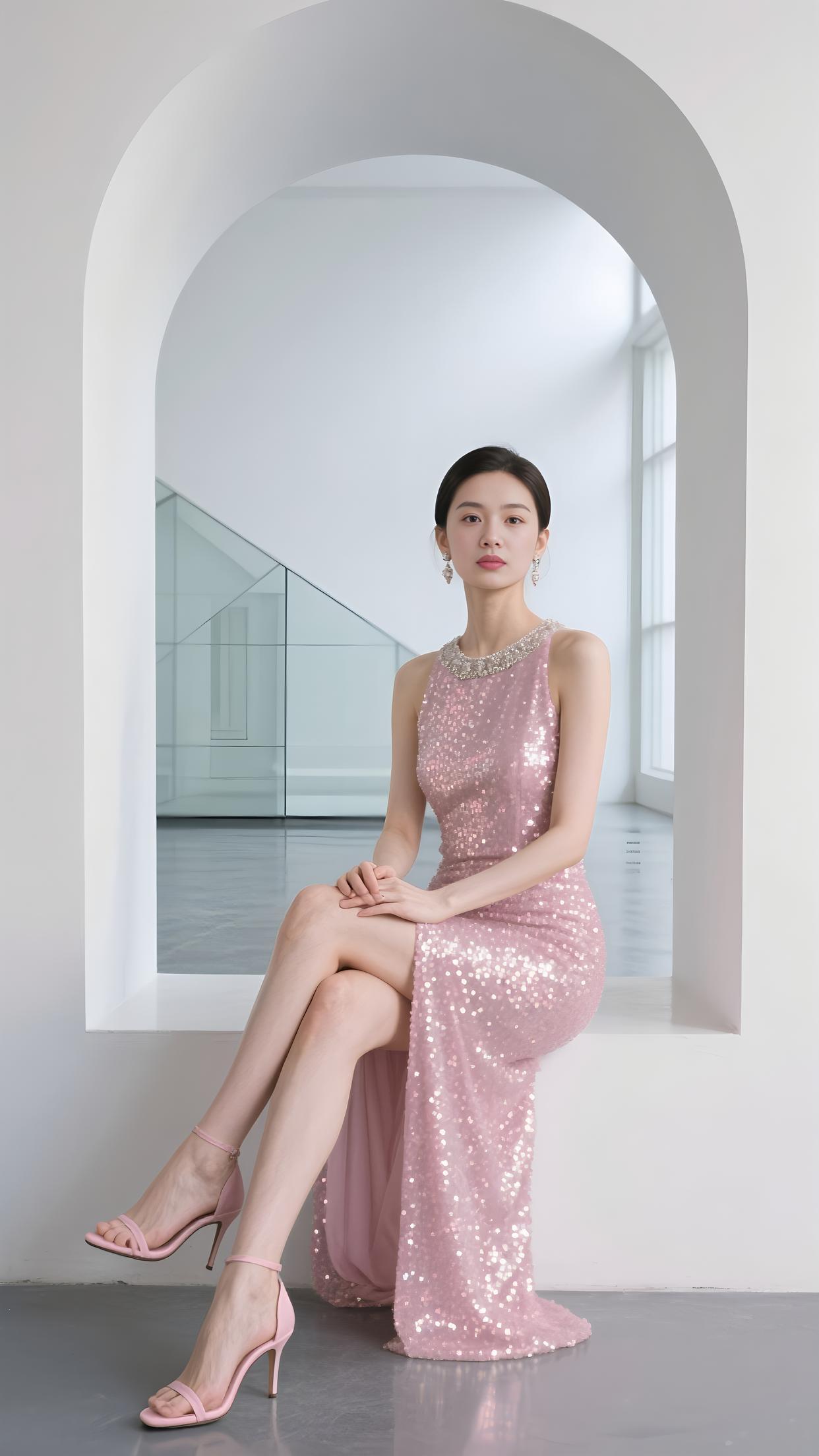 粉亮的裙裾缀满星芒,V 领银饰轻吻颈旁。在拱门下坐成风景,长腿随开衩漾起柔浪。眼眸沉静,如月光轻淌,每片亮片,都是梦的偏旁。