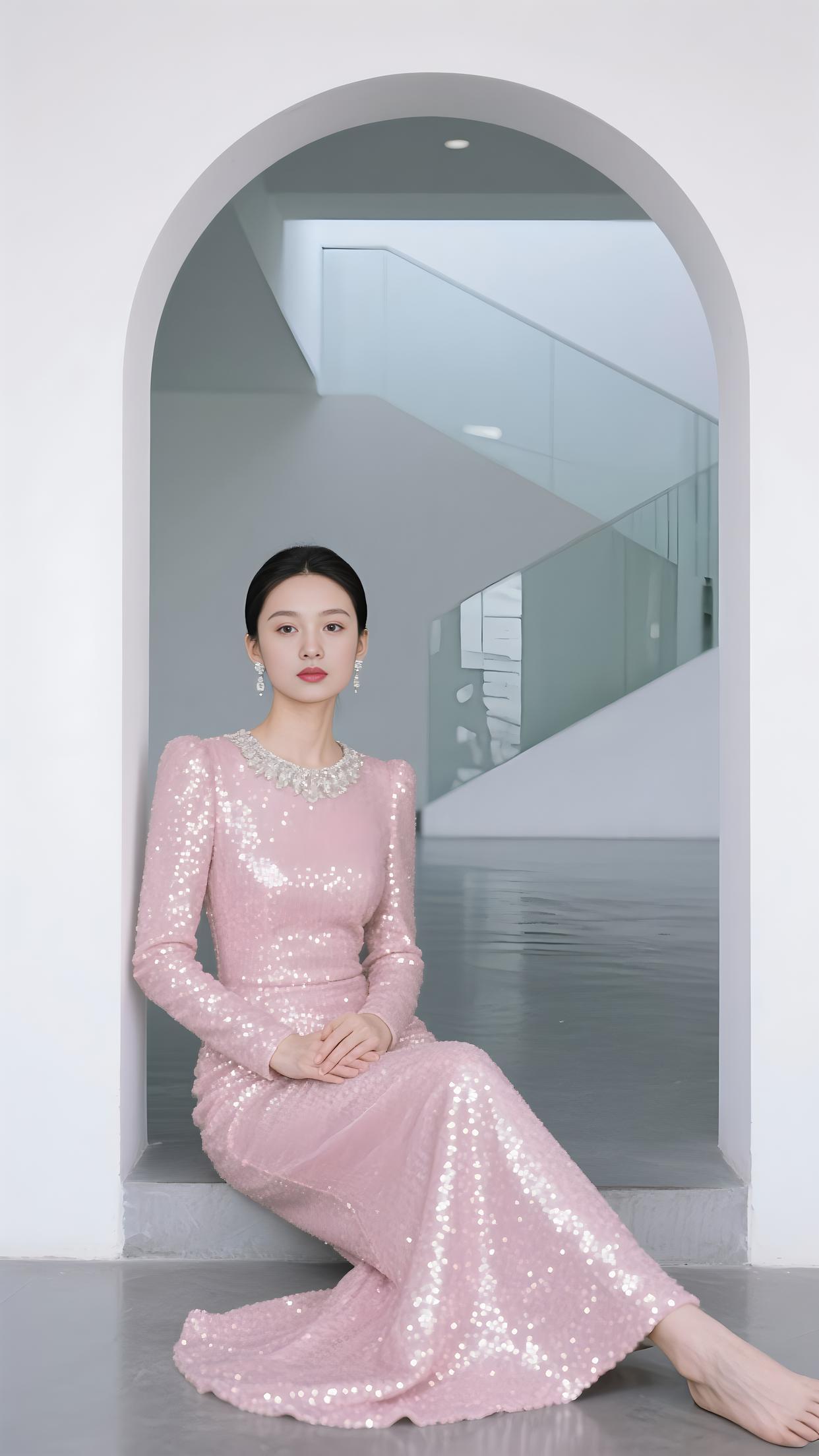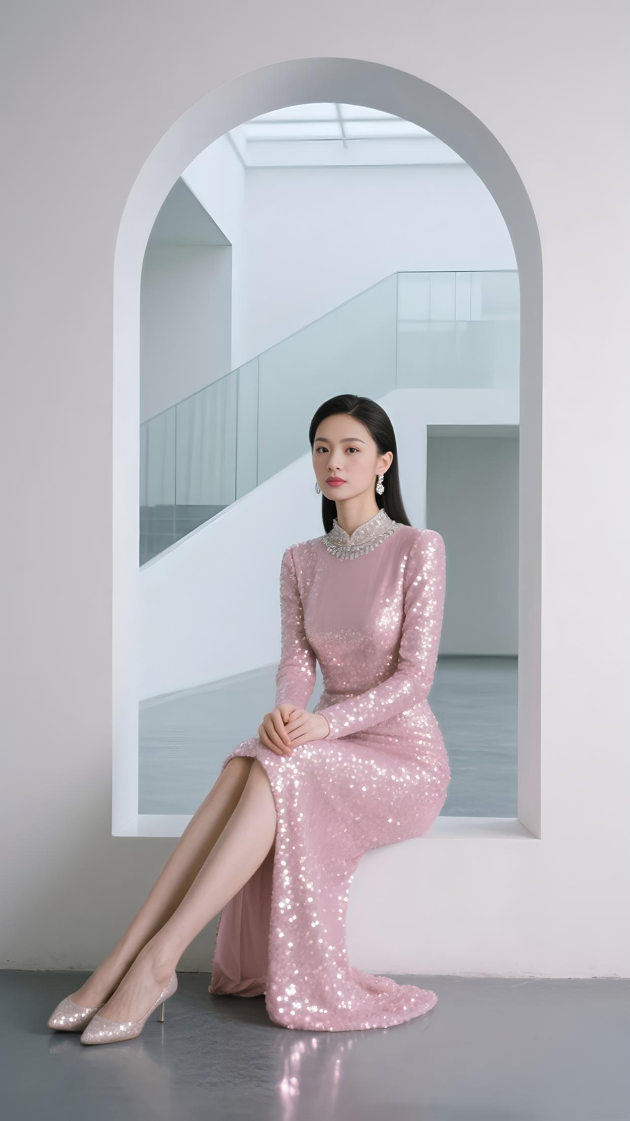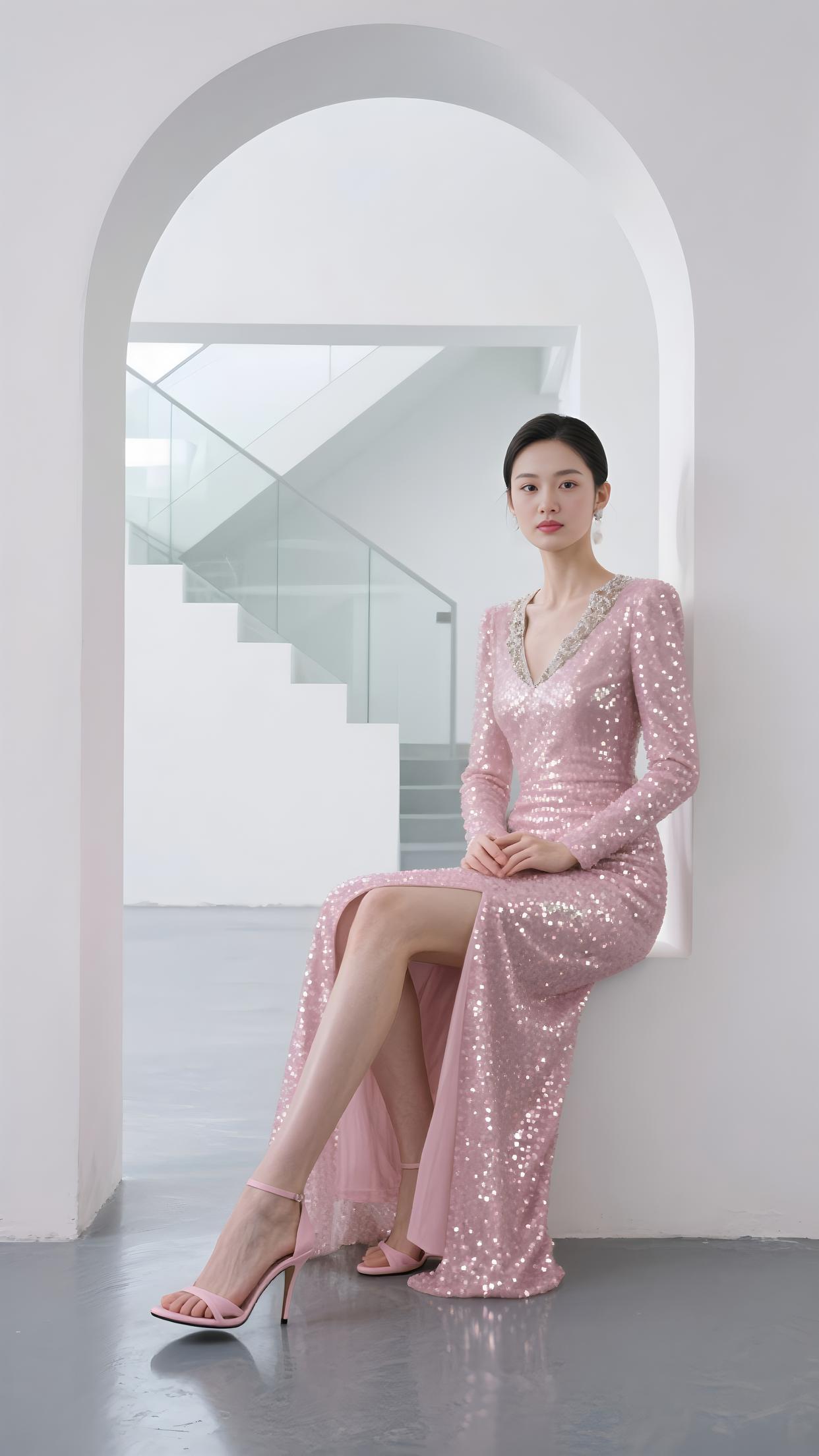 粉亮的裙裾缀满星芒,V 领银饰轻吻颈旁。在拱门下坐成风景,长腿随开衩漾起柔浪。眼眸沉静,如月光轻淌,每片亮片,都是梦的偏旁。
