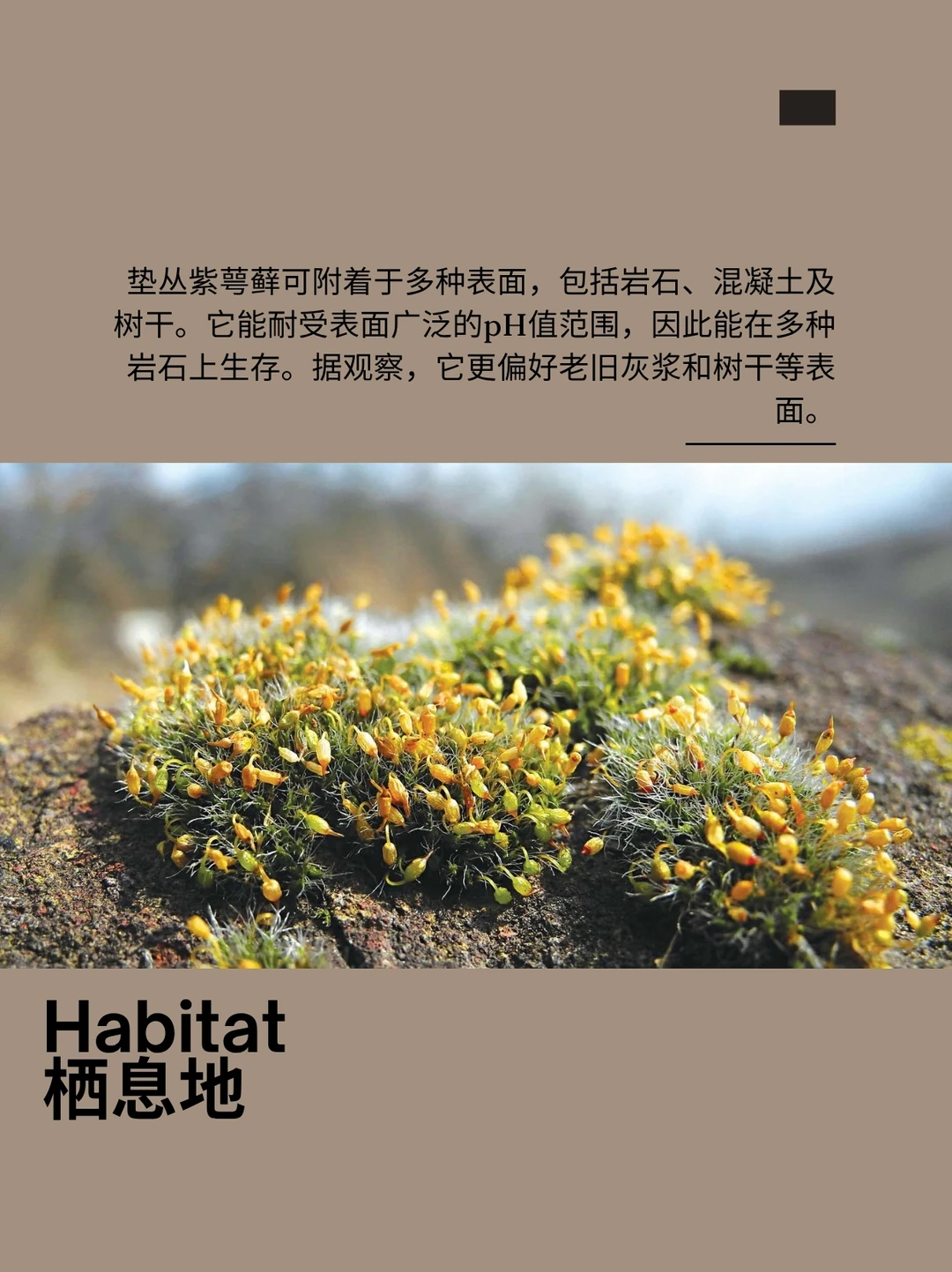 垫丛紫萼藓可附着于多种表面,包括岩石、混凝土及树干。它能耐受表面广泛的pH值范围,因此能在多种岩石上生存。据观察,它更偏好老旧灰浆和树干等表面。