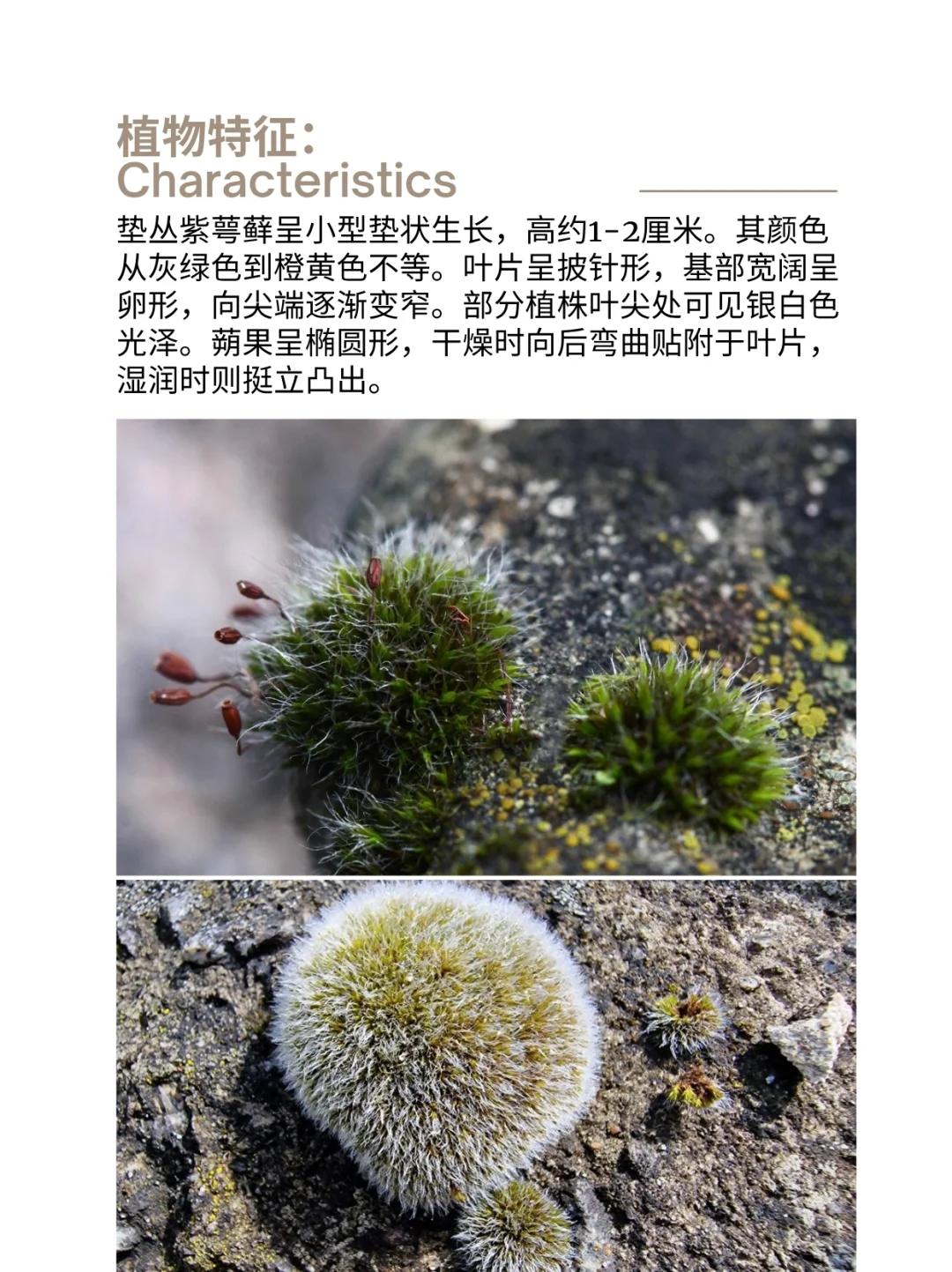 垫丛紫萼藓呈小型垫状生长,高约1-2厘米。其颜色从灰绿色到橙黄色不等。叶片呈披针形,基部宽阔呈卵形,向尖端逐渐变窄。部分植株叶尖处可见银白色光泽。蒴果呈椭圆形,干燥时向后弯曲贴附于叶片,湿润时则挺立凸出。