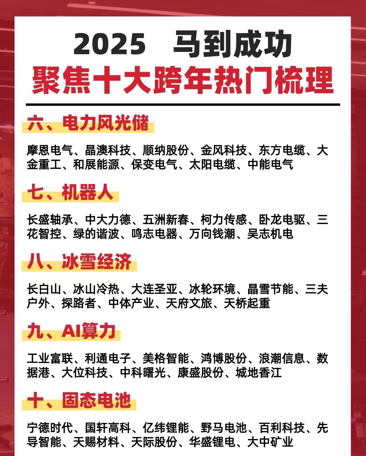 “2025 马到成功 聚焦十大跨年热门梳理”,分别介绍了十个当前备受关注的行业或概念板块及其相关的代表性企业。 第一张图片展示了前五个热门板块: 1. 马字辈:包括福龙马、神马电力、中马传动等,多为企业名称中带有“马”字或与马相关概念的公司。 2. 海峡两岸:如平潭发展、闽东电力、合富中国等,聚焦与海峡两岸经济交流、区域发展相关的企业。 3. 芯片半导体:涵盖香农芯创、江波龙、北方华创、兆易创新等,代表国内芯片、半导体及上下游产业链的重要企业。 4. 量子科技:有国盾量子、科大国创、中科曙光、亨通光电等,涉及量子通信、计算及相关前沿技术。 5. 核聚变:包括兰石重装、安泰科技、上海电气、中广核技等,主要聚焦核聚变能源及相关装备制造企业。 第二张图片则继续介绍后五个热门板块: 6. 电力风光储:如摩恩电气、晶澳科技、金风科技、东方电缆等,涉及电力、风电、光伏及储能相关企业。 7. 机器人:包含长盛轴承、中大力德、三花智控、绿的谐波等,代表机器人核心零部件及智能制造领域的公司。 8. 冰雪经济:如长白山、冰山冷热、大连圣亚、探路者等,与冰雪运动、旅游及低温相关产业有关。 9. AI算力:包括工业富联、浪潮信息、中科曙光、鸿博股份等,聚焦人工智能计算能力及数据中心相关企业。 10. 固态电池:如宁德时代、国轩高科、亿纬锂能、天赐材料等,代表新一代电池技术,尤其是固态电池研发制造企业。 整体来看,这十大板块涵盖了新能源、高端制造、前沿科技、区域经济、冬季经济等多个热门投资与产业发展方向,所列企业均为各领域内具有代表性的公司,反映了2025年跨年期间资本市场和舆论关注的热点领域。