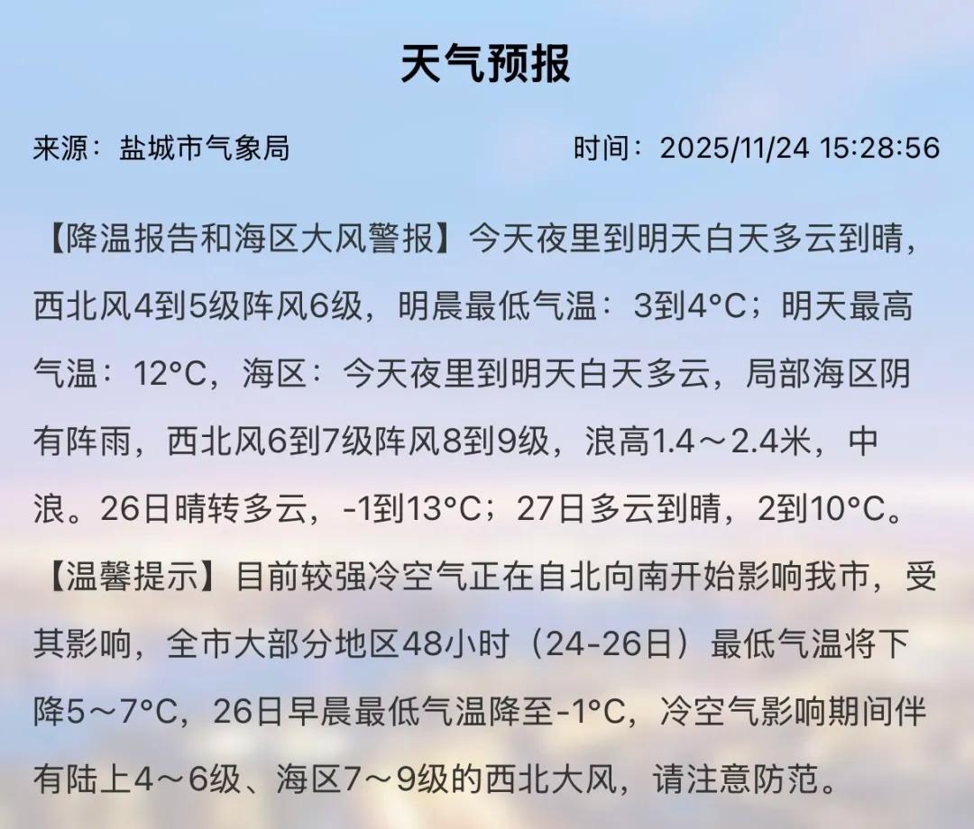 江苏盐城:大风+降温!冷空气即将抵达盐城 盐城市气象台2025年11月24日09时32分发布海区大风黄色预警信号受冷空气影响预计今天夜里到明天白天盐城海区将出现8到9级的阵风市海事、应急、气象联合提醒做好防范