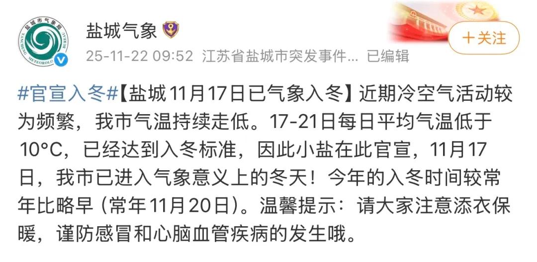 江苏盐城:大风+降温!冷空气即将抵达盐城 盐城市气象台2025年11月24日09