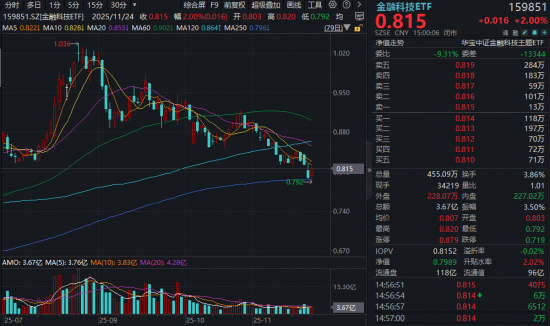 热门ETF方面,同类规模最大的金融科技ETF(159851)早盘一度再探调整新低,午后反弹走高,场内价格收涨2%,单日成交3.67亿元。技术面上,年线失而复得,表明市场信心在关键位置得到修复。