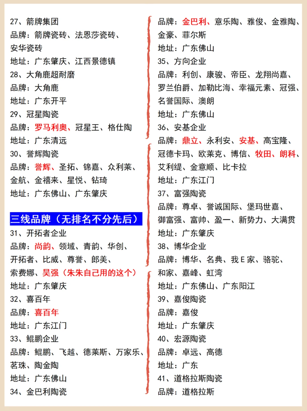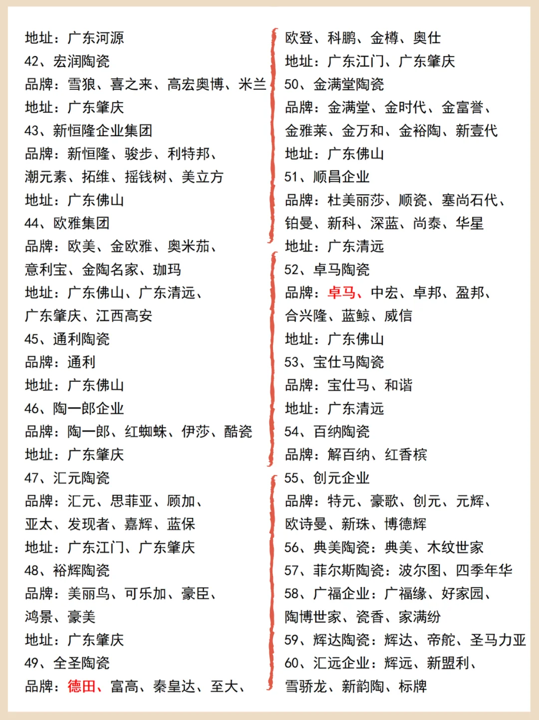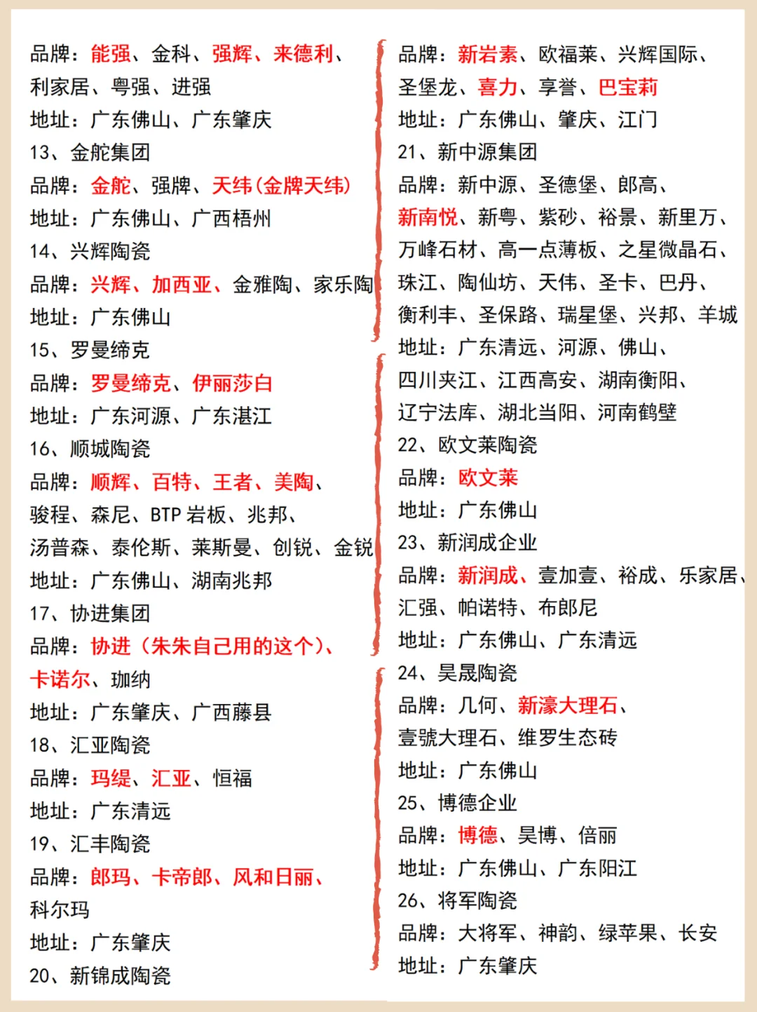 图片中列举了一些广东大厂,我标红的那些,都是不错的品牌,可以选。虽然名单没有穷尽广东砖,但不在名单里面的品牌,慎重选择,真的,慎重。