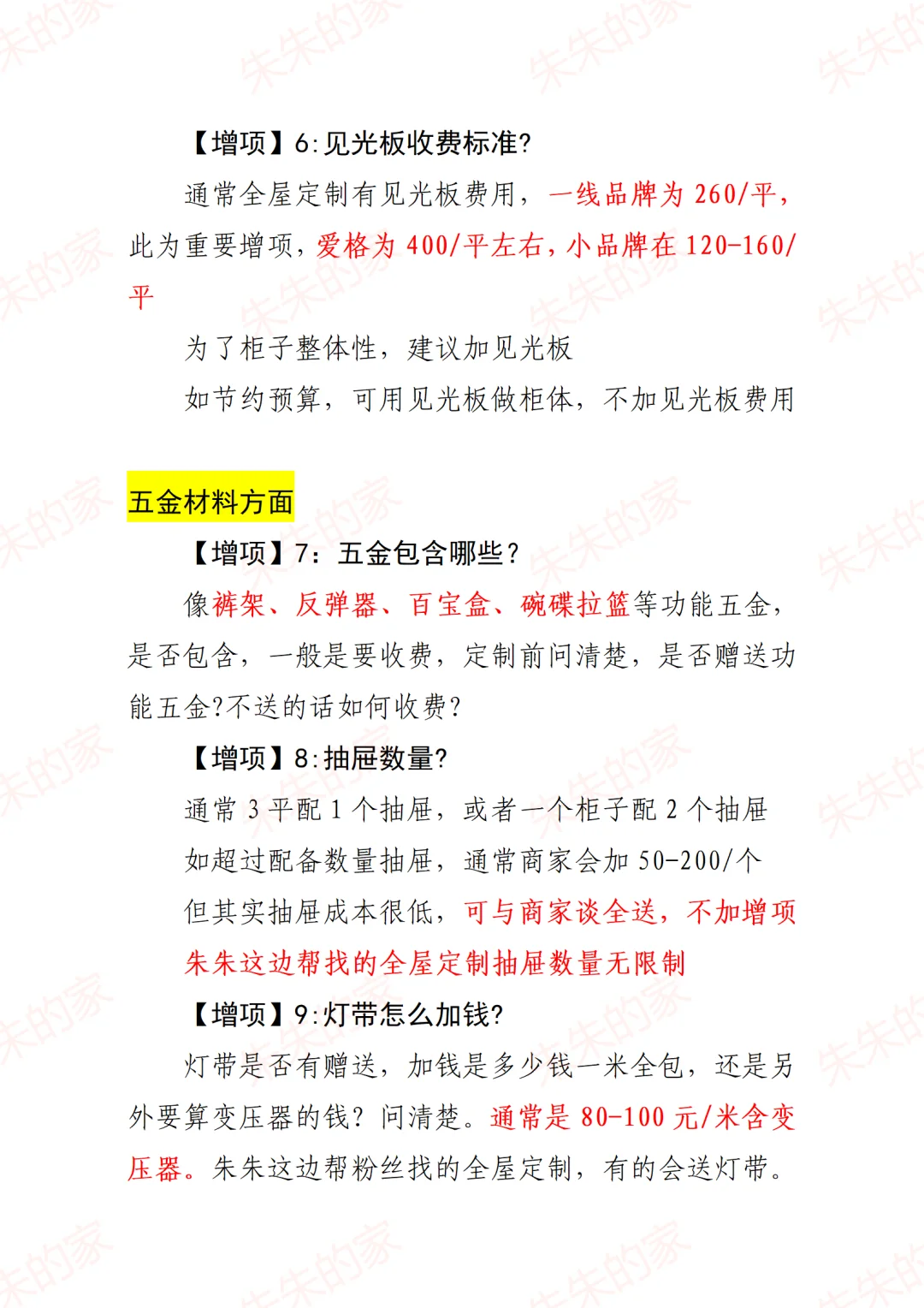 3️⃣常见增项:玻璃、灯带和见光板,裤抽、拉篮、拖底轨道等功能五金。