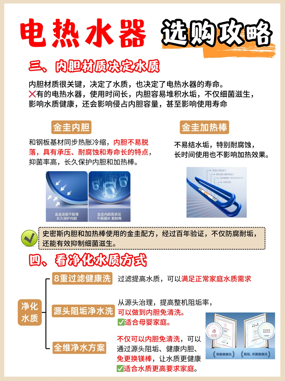 ③想要一步到位,建议全维净水方案。不仅可以内胆免清洗,可以通过源头阻垢、健康内胆、免更换镁棒,适合水质更高要求家庭
