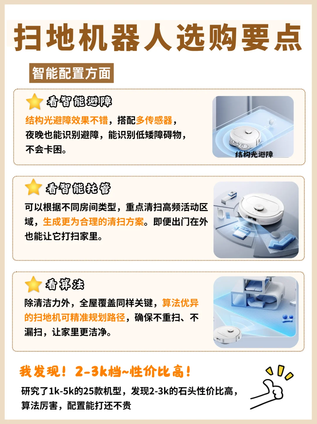 √智能避障:清洁的同时不横冲直撞、不卡困,结构光避障效果不错,搭配多传感器,夜晚也能识别避障,能识别低矮障碍物,不会卡困。