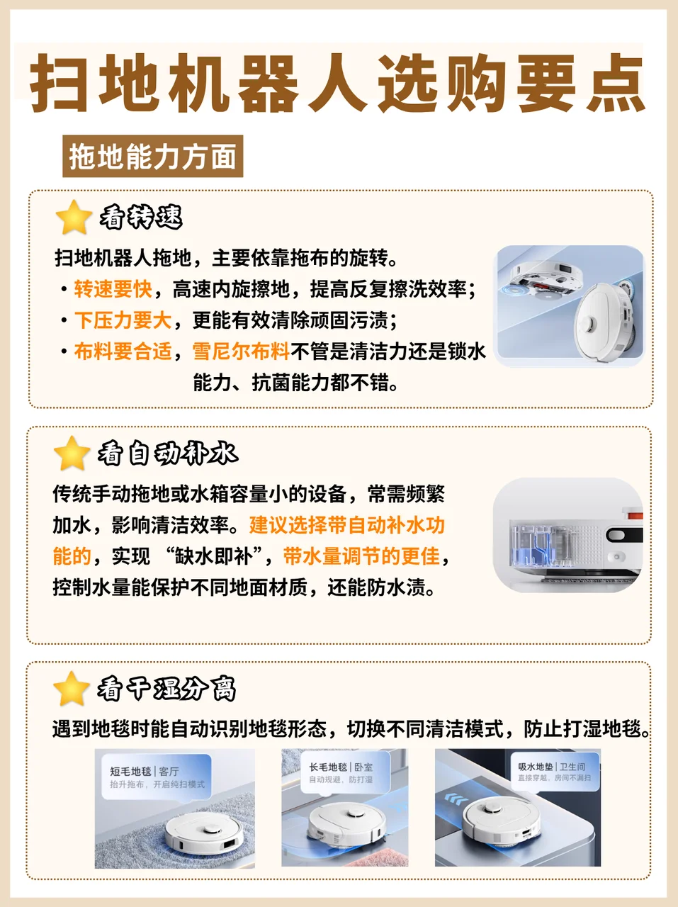 √干湿分离:家里有地毯的,优选扫地机上地毯懂得抬起拖布的,不打湿弄脏