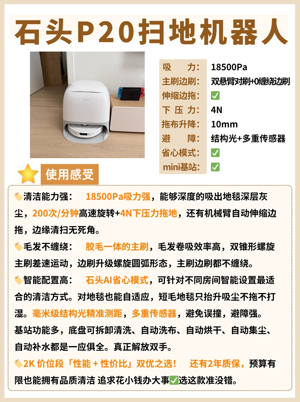 综合来说:石头P20是2K 价位段「性能 + 性价比」双优之选!预算有限也能拥有品质清洁 还有2年质保,用着也有保障,追求花小钱办大事选这款准没错