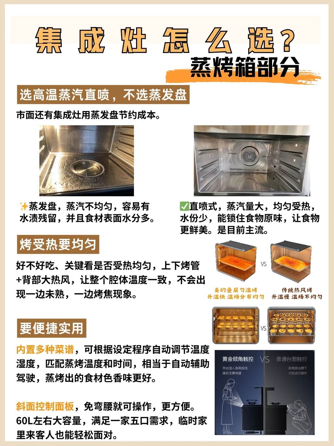 ③要便捷实用。内置多种菜谱,相当于自动辅助驾驶,蒸烤出的食材色香味更好。斜面控制面板,免弯腰就可操作,更方便。60L左右大容量,满足一家五口需求。