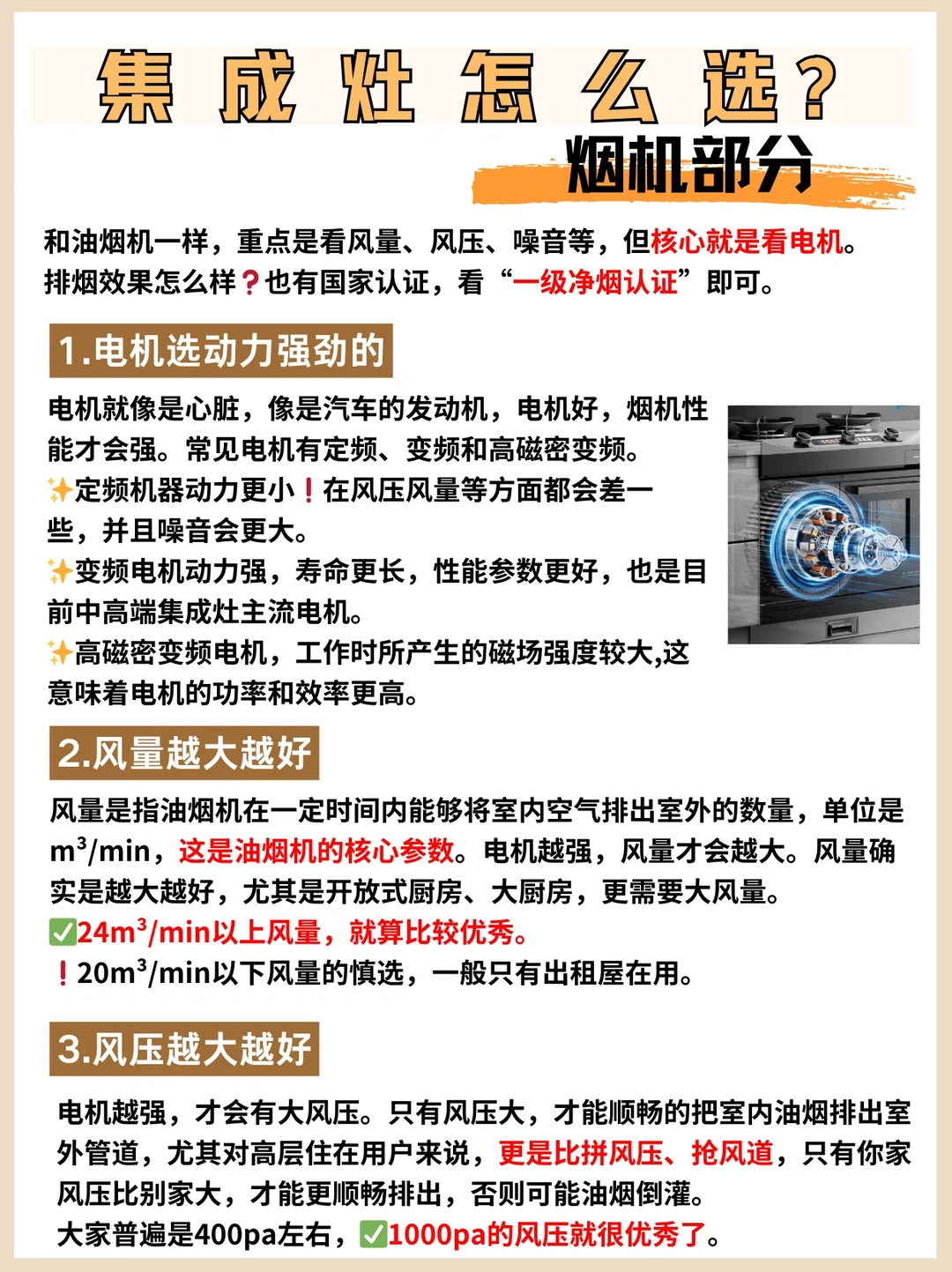 和油烟机一样,重点是看风量、风压、噪音等,但其实核心就是看电机。排烟效果看“一级净烟认证”即可。