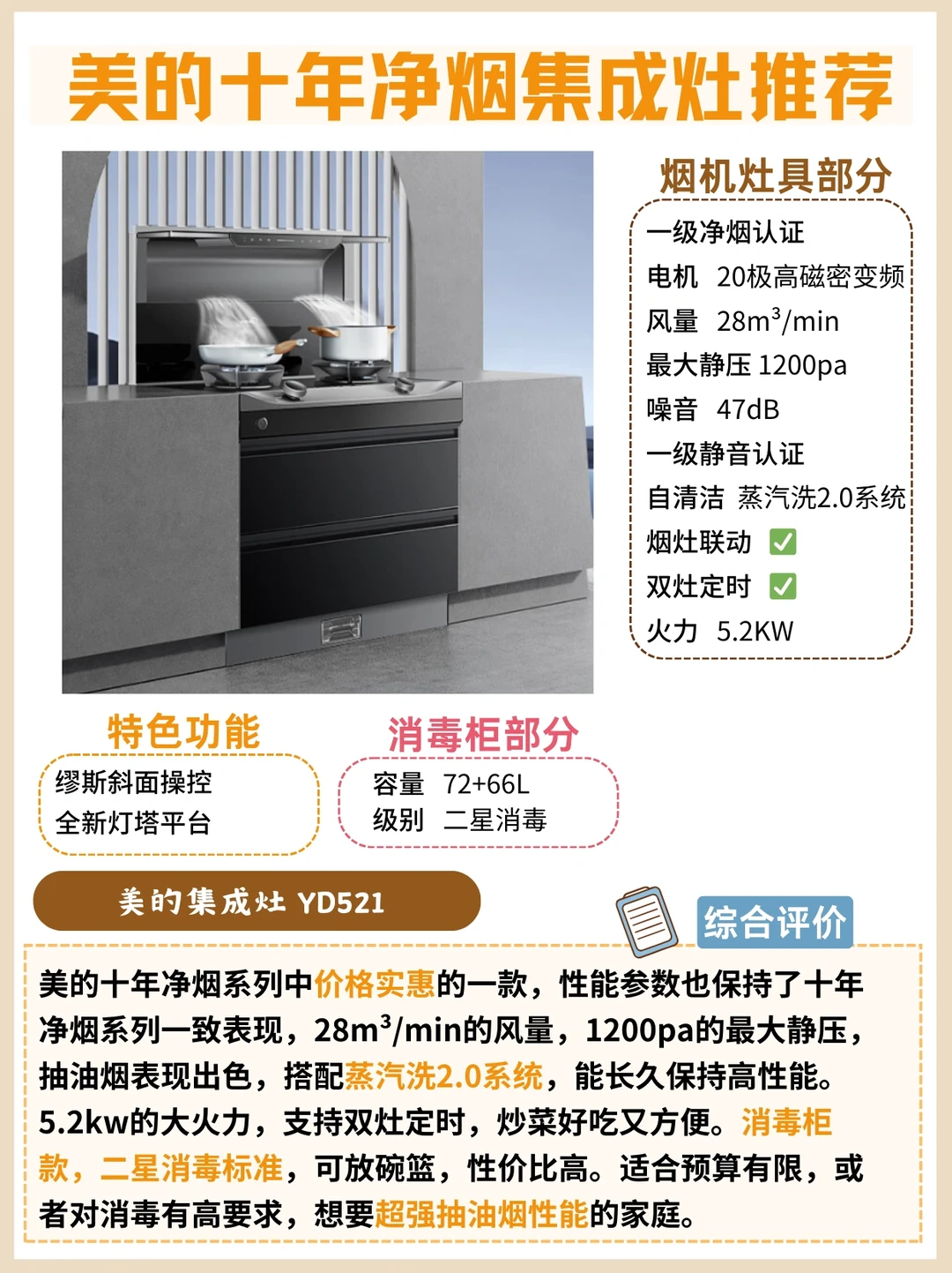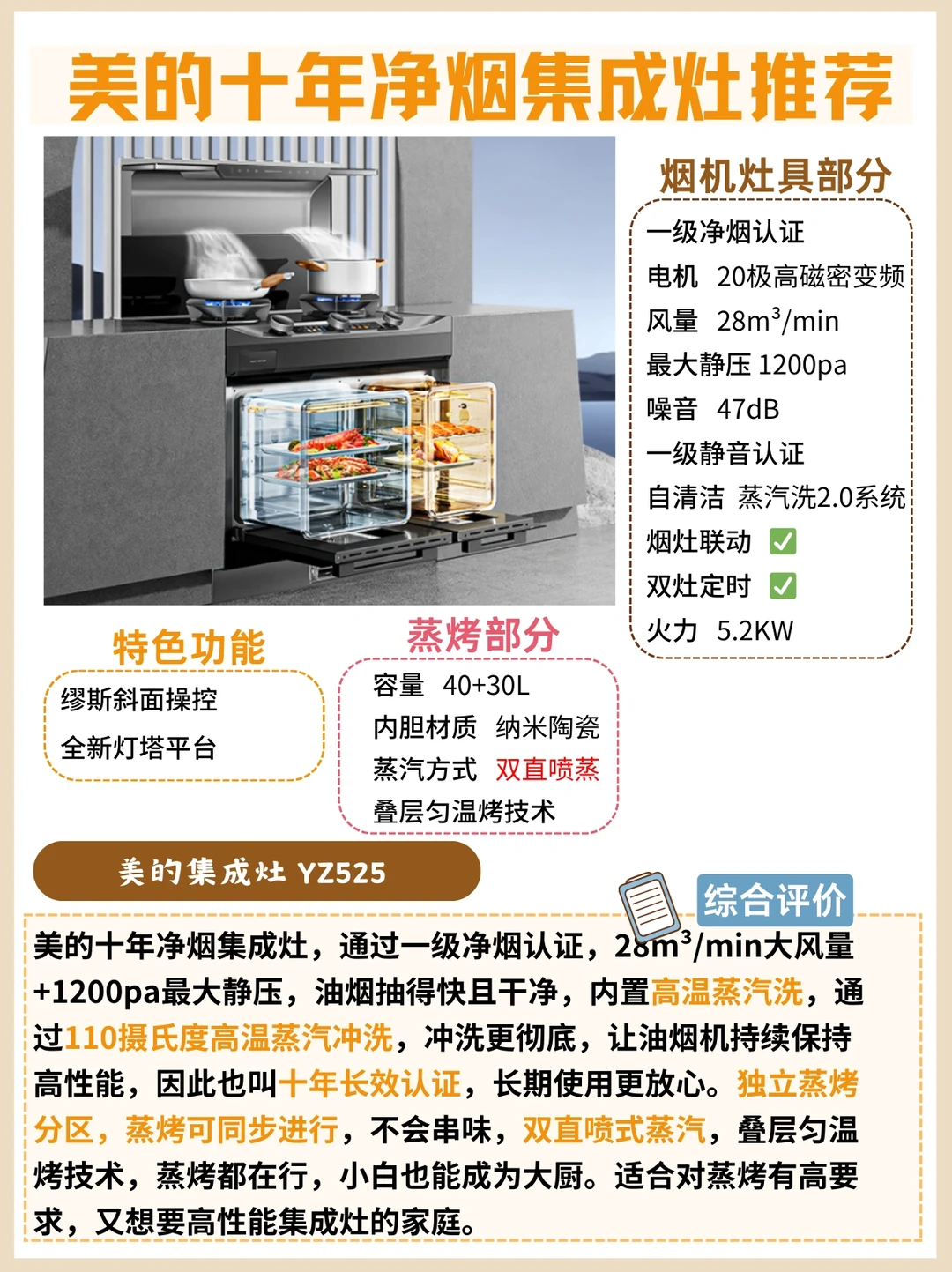 美的十年净烟系列YZ525,独立蒸烤设计,性能强。