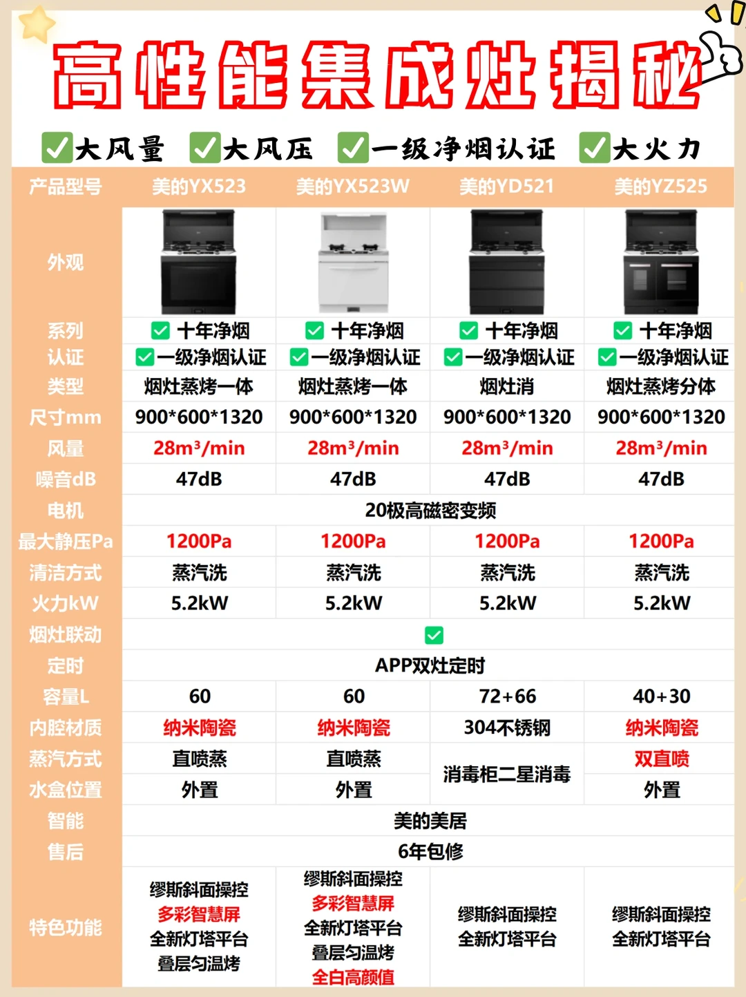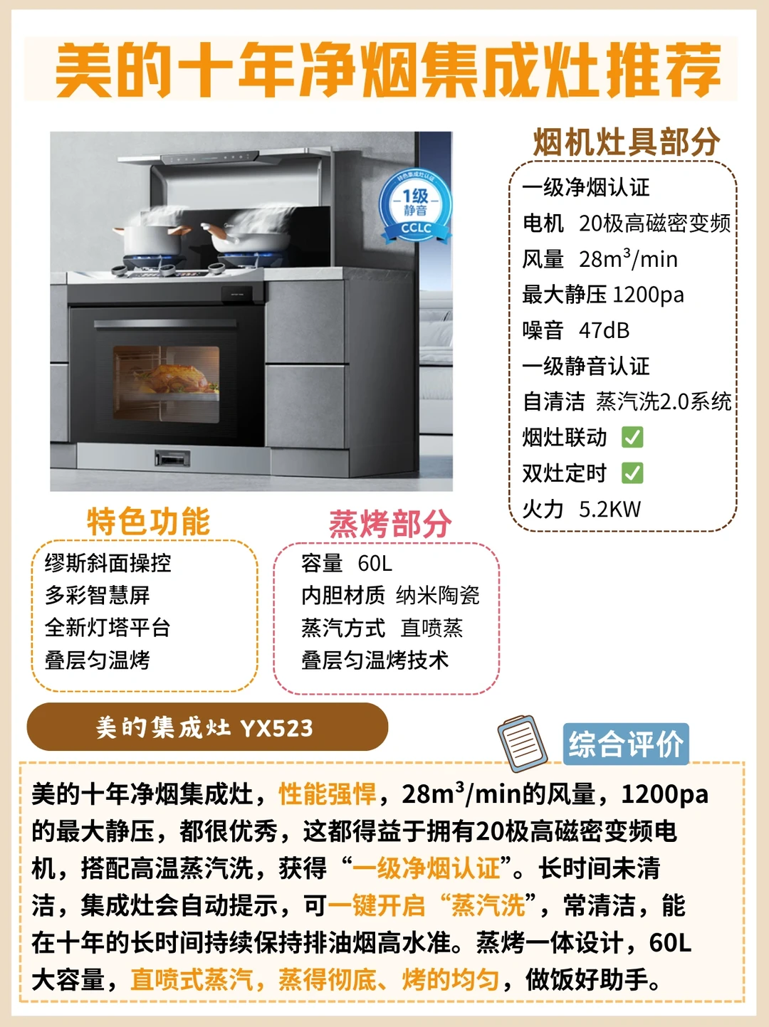 美的集成灶十年净烟系列,搭配20极高磁密变频电机,拥有28m³/min的风量,1200pa的最大静压,性能强悍,获得“一级净烟认证”,可一键开启“蒸汽洗”,能在十年的长时间持续保持排油烟高水准。