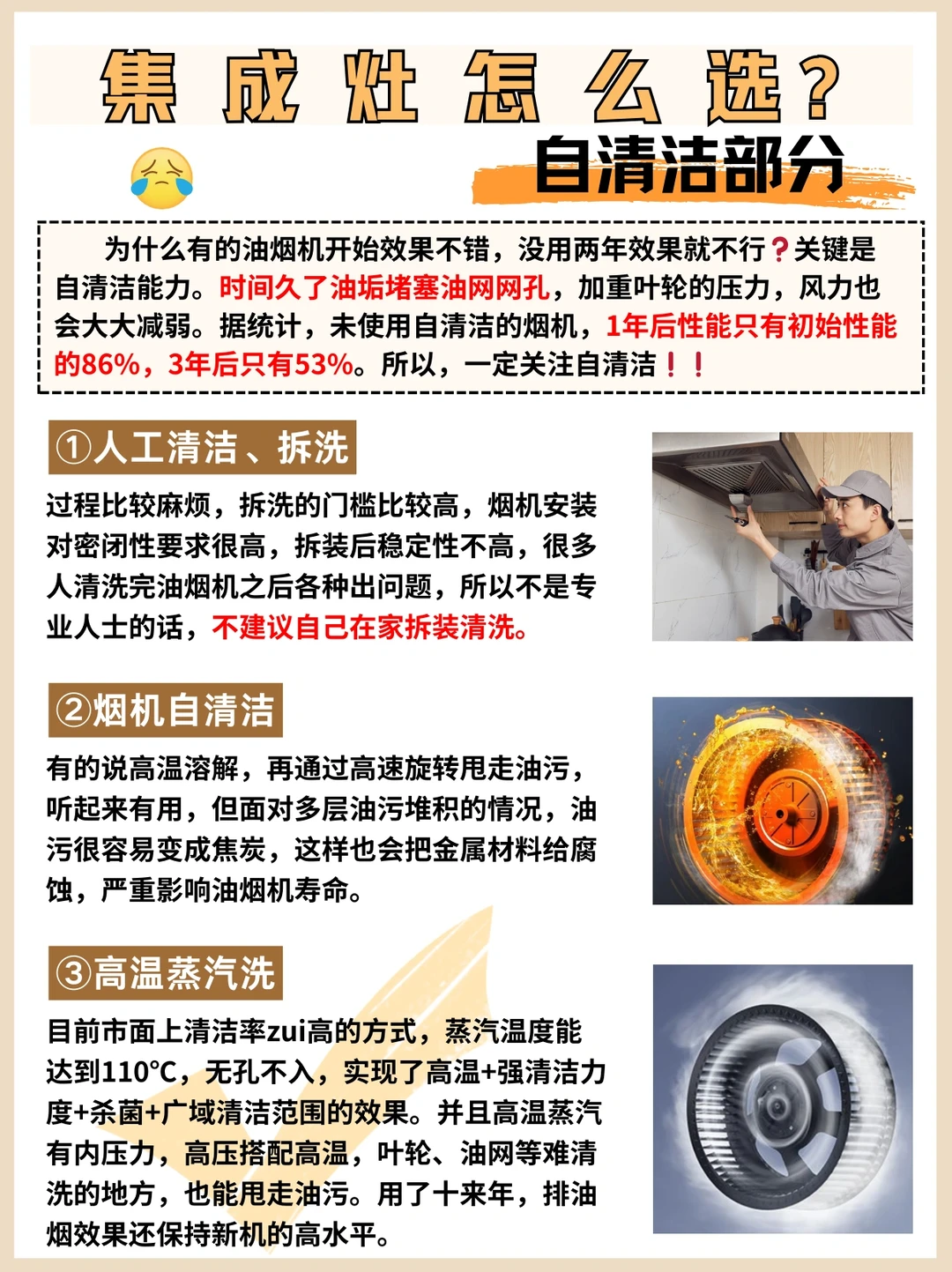 有的油烟机开始效果不错,没用两年效果就不行,关键是自清洁能力。