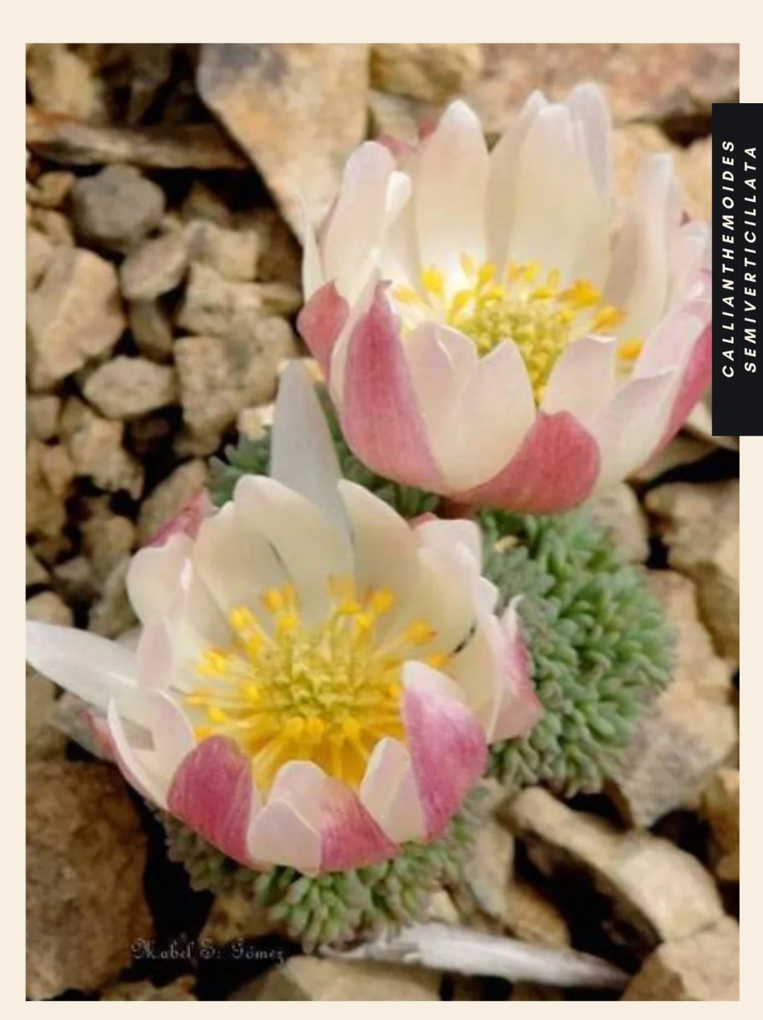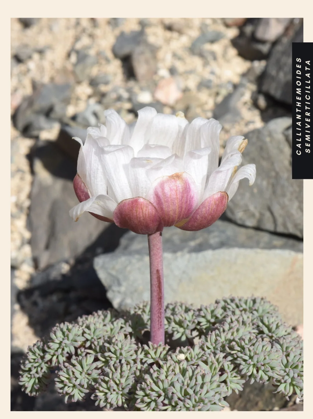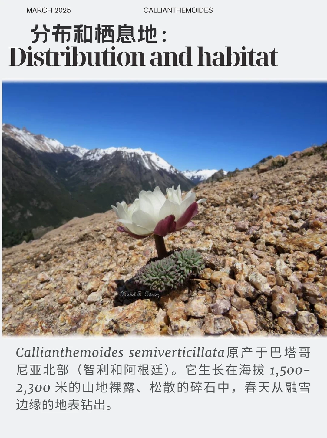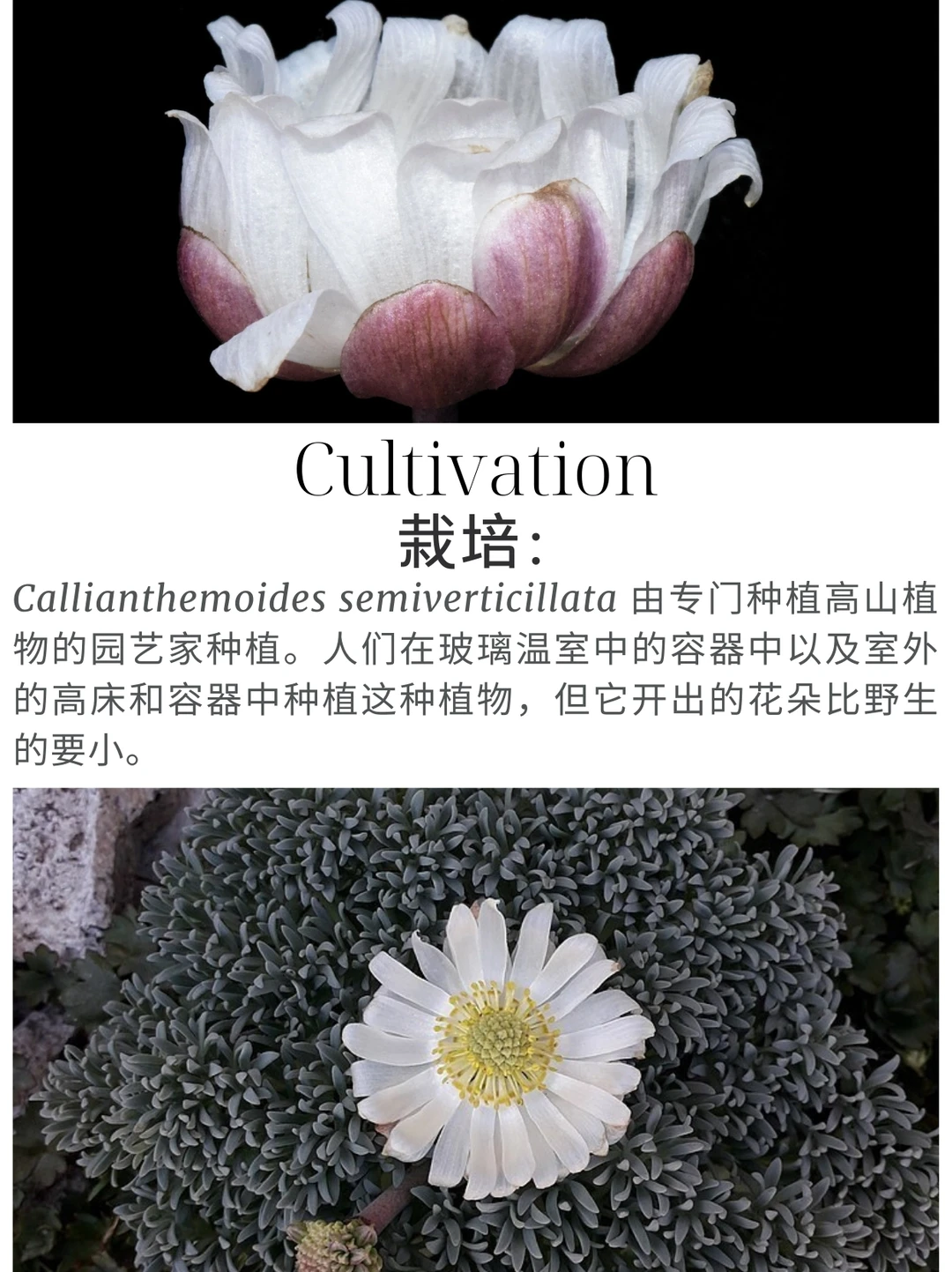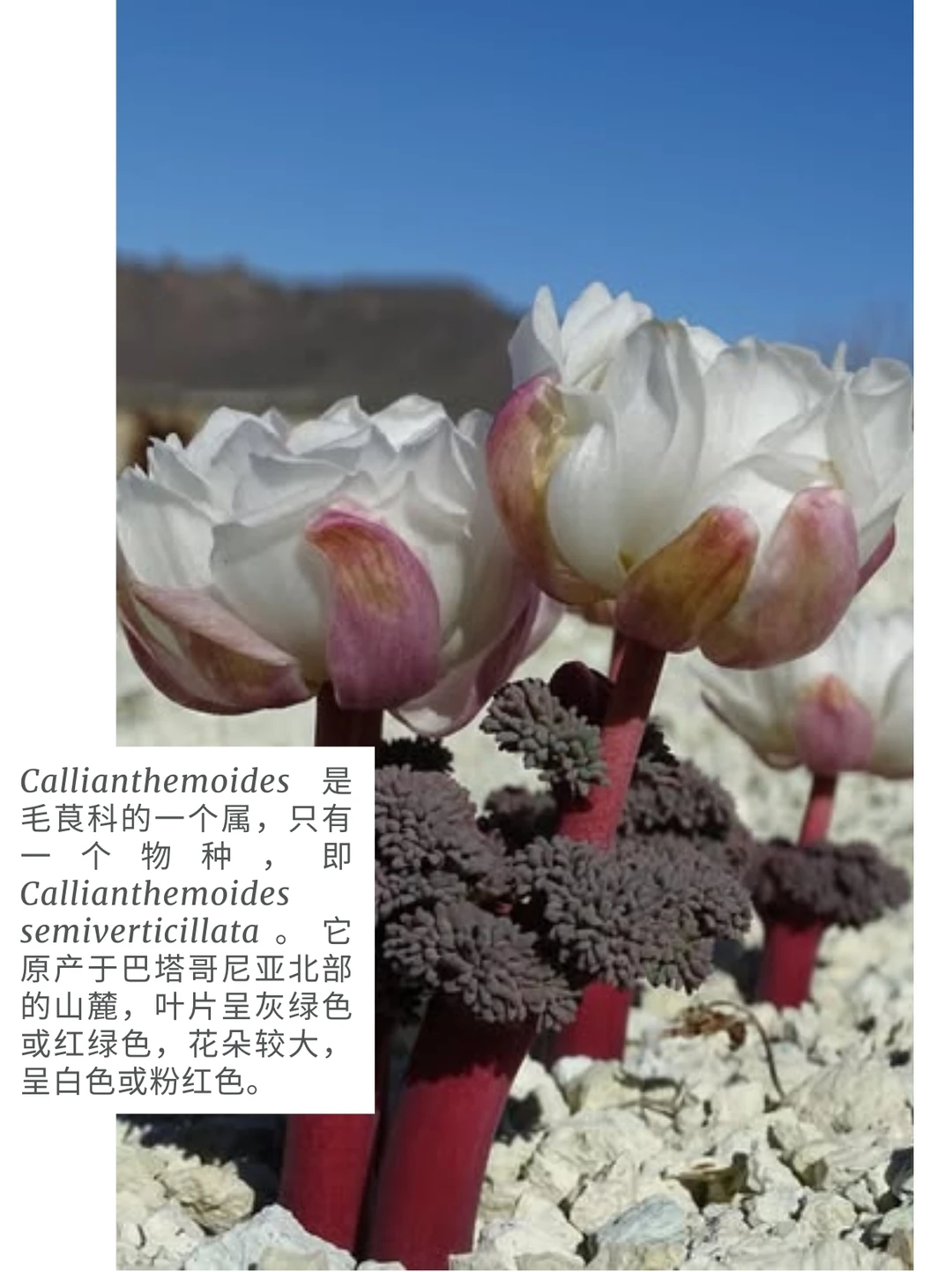 高山植物 山野草 盆栽 毛茛科 美花毛茛属 Callianthemoides semiverticillata 巴塔哥尼亚 智利 阿根廷 Callianthemoides是毛茛科的一个属,只有一个物种,即Callianthemoides semiverticillata。它原产于巴塔哥尼亚北部的山麓,叶片呈灰绿色或红绿色,花朵较大,呈白色或粉红色。