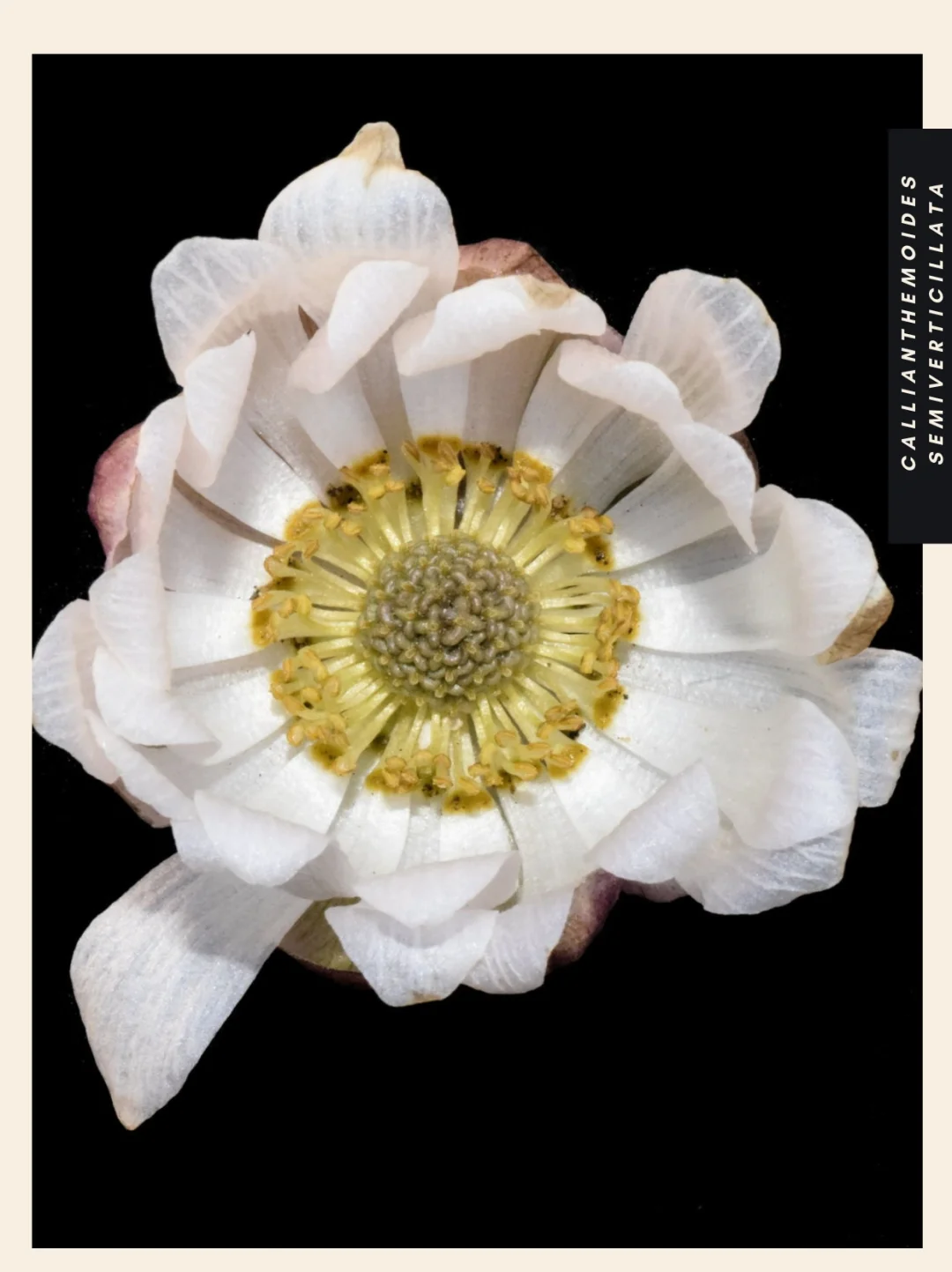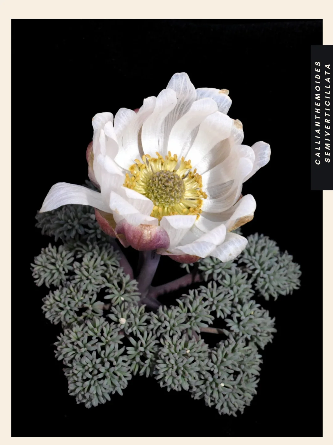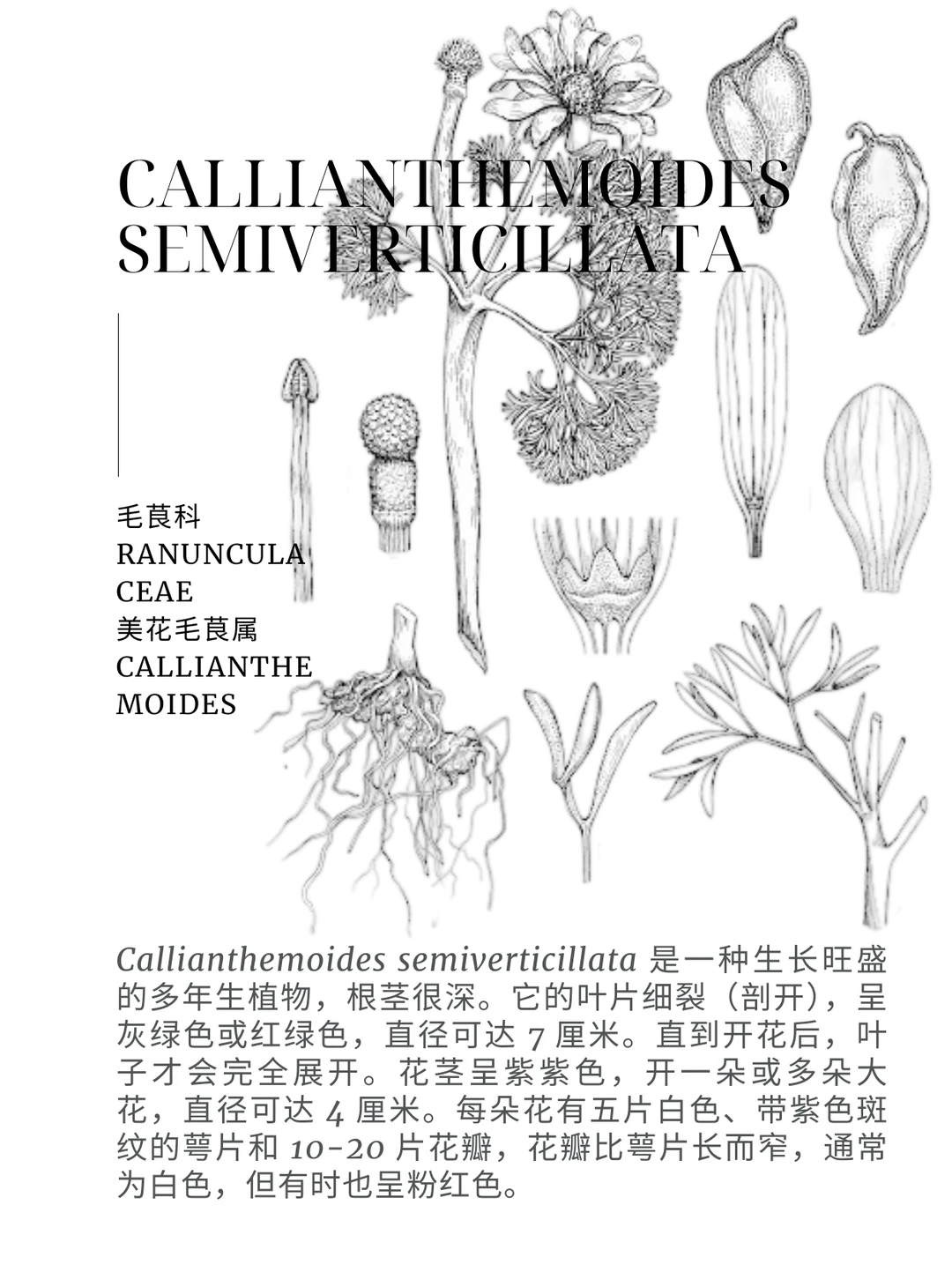 Callianthemoides semiverticillata 是一种生长旺盛的多年生植物,根茎很深。它的叶片细裂(剖开),呈灰绿色或红绿色,直径可达 7 厘米。直到开花后,叶子才会完全展开。花茎呈紫紫色,开一朵或多朵大花,直径可达 4 厘米。每朵花有五片白色、带紫色斑纹的萼片和 10-20 片花瓣,花瓣比萼片长而窄,通常为白色,但有时也呈粉红色。