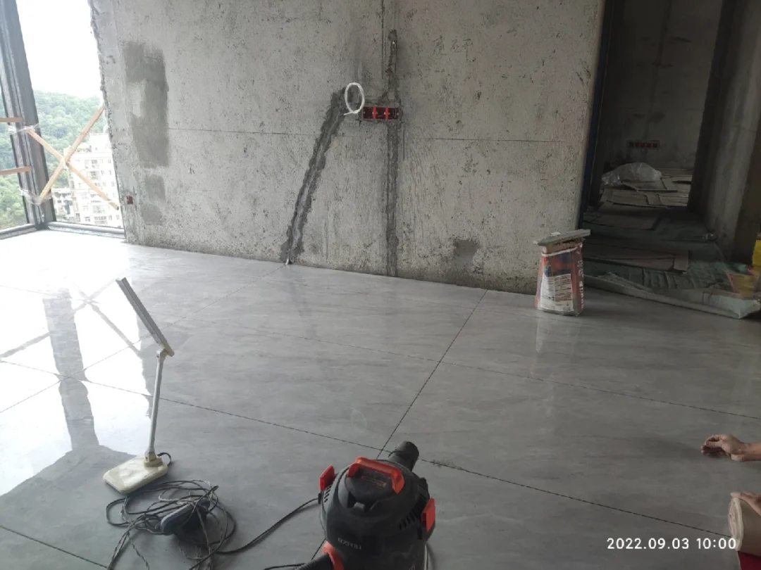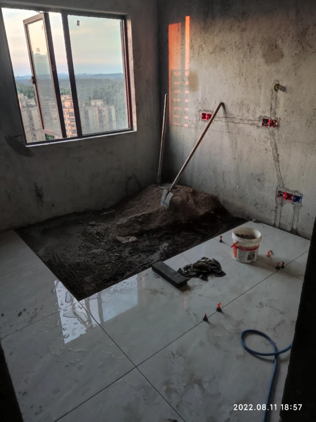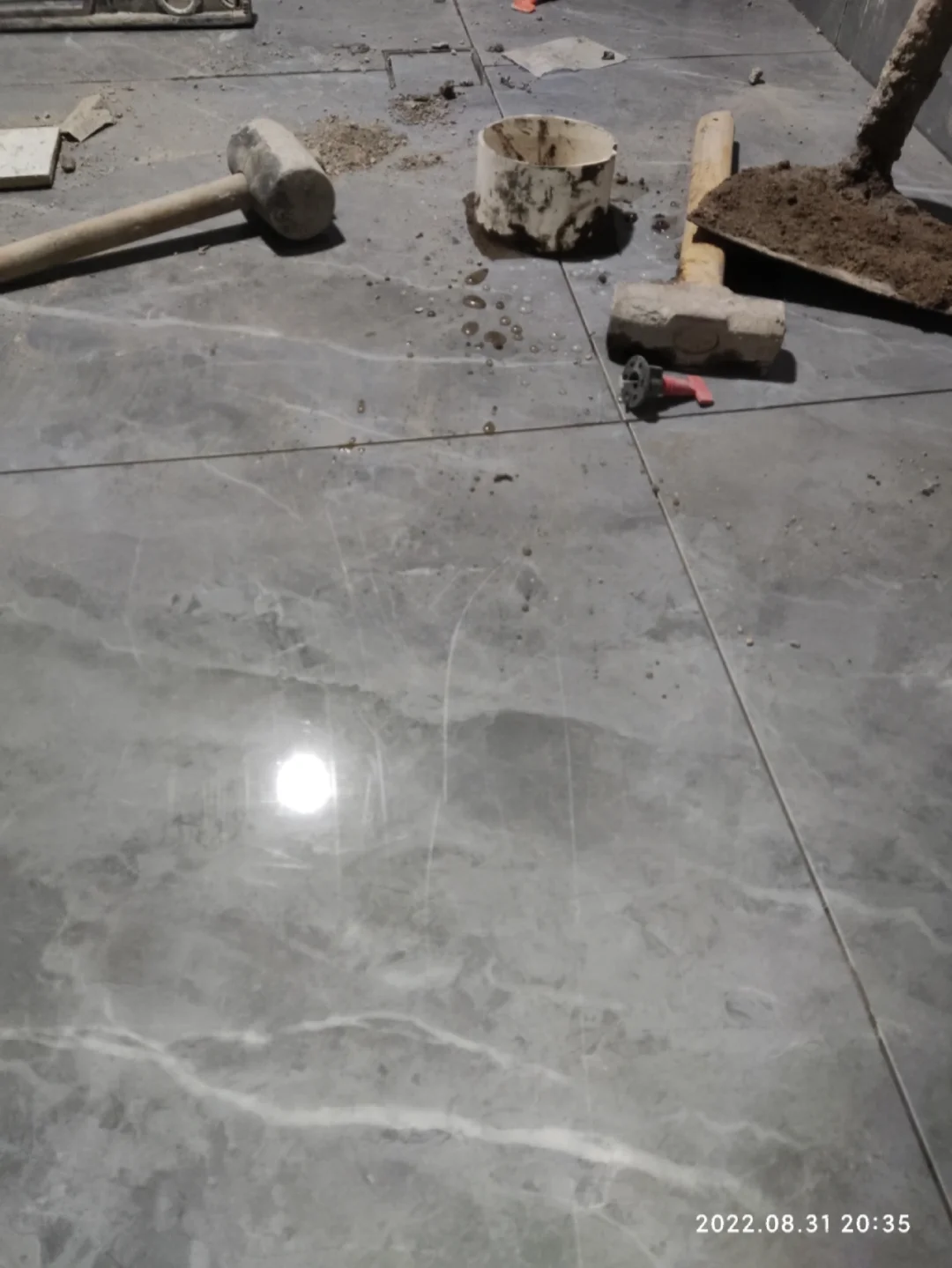 贴第二个卫生间的时候,地上全划痕,装了沙子的水桶,在地上拖动,全划痕,只能翘起来换砖,见图7