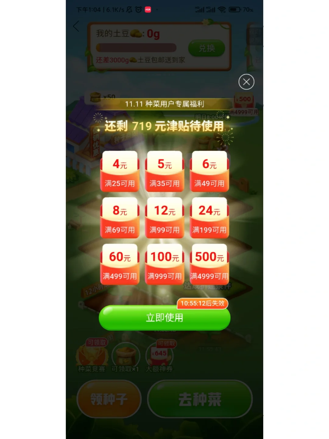 [三R]种菜,首页点击免fei领水果,进去后,点击种菜得菜,先把种子种下去,开拓几个荒地,再种,就会弹出大额优惠券。见图八。这个券百亿补贴也可叠加。