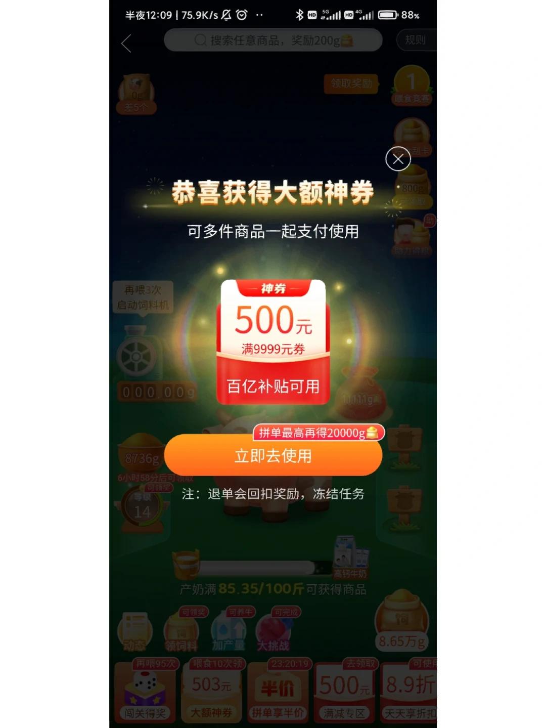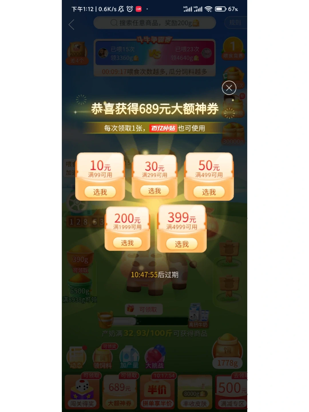 [六R]多多牧场,点击个人中心,在设置上面点进去,会出现一头牛,选择奶牛,不要黄金牛。然后玩几下。多喂饲料,每个按钮都要按,玩个15分钟,差不多就会弹出第二件半价。然后按照我主页之前的教程,领取1999-400的神券,这个券用来买华凌神机,红米k50,都是非常合适。