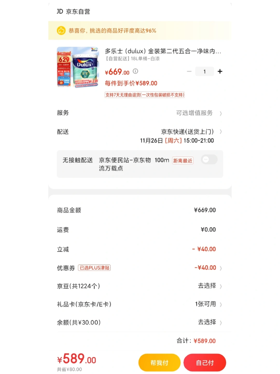 为什么选择多乐士金装二代之前在笔记中已经说了 乳胶漆最关键的核心参数 耐擦洗次数1万次 超越优等品的品质 五合一功能齐全的乳胶漆 超高性价比的首选 线下一般760左右 现在线上576拿下 与线下一代价格一样 比一代多了抗菌,耐擦洗次数多4k次,多66% 方法: 直接找到某东,多乐士自营 9.9开通499减40的家装月卡 京粉返利13 最后576拿下 比我几个月前买的便宜一块钱