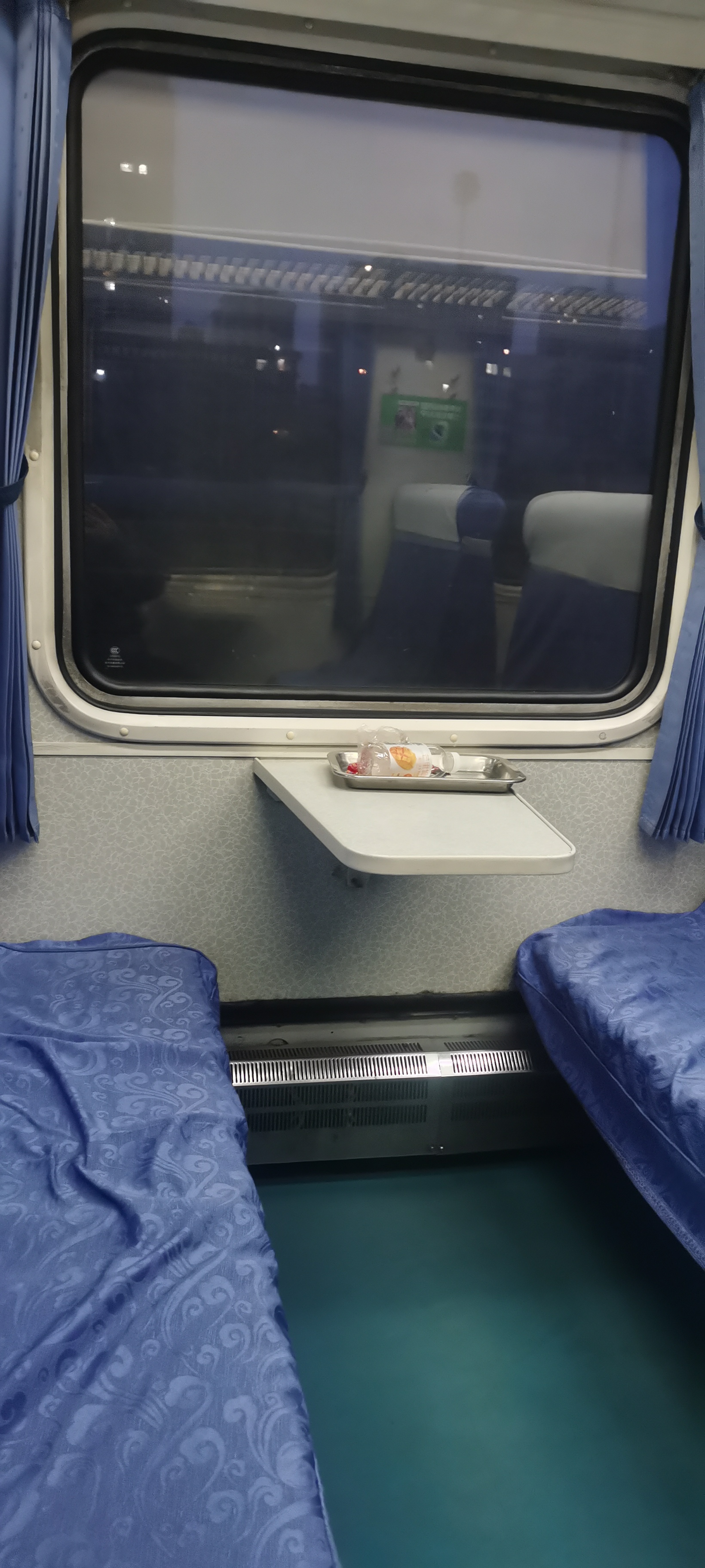 夜里,大家大都在坐位上睡下了,由于车厢乘客少的原因,每个人都能够横躺下,我们无意中等同于省了100元买了一个硬卧。