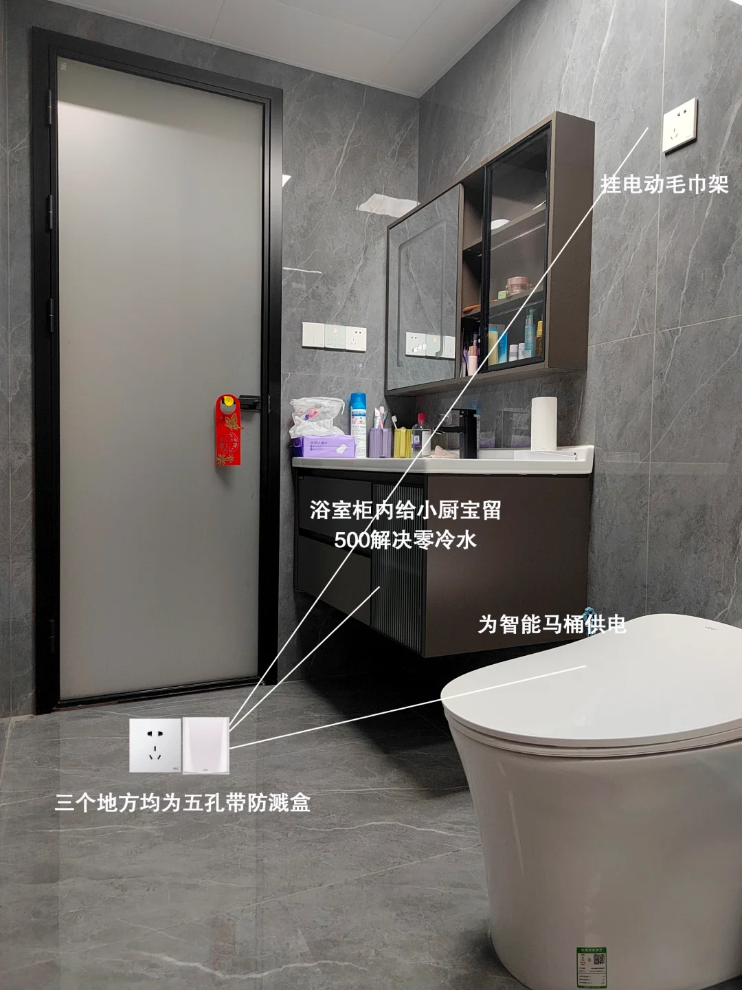 4.卫生间注意三个,马桶、电动毛巾架、浴室柜留小厨宝
