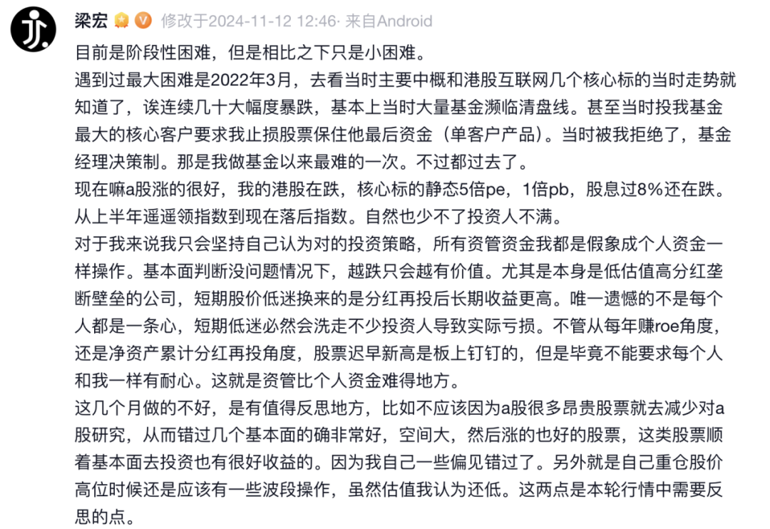去年11月份,梁宏也曾因业绩回撤公开做出解释,发文反思错过A股行情。对于部分投资人不满的情况,梁宏彼时回应称,只会坚持自己认为对的投资策略,所有资管资金都是当成个人资金操作。