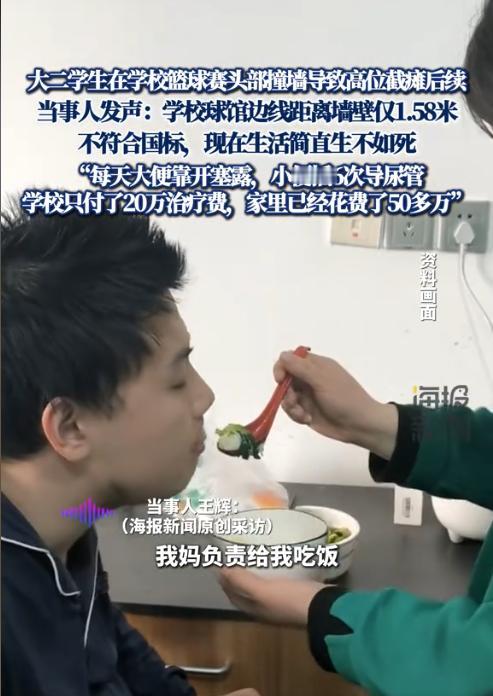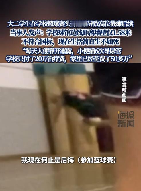 上海,一大二男生在校内篮球赛中因抢球不慎头部撞墙,致四肢瘫痪,经鉴定为1级残疾。事后,男生家属认为篮球馆的地板不行,墙壁又太硬,存在安全隐患为由,要求校方赔偿480万元,但校方只同意赔偿50万元,并要求男生的家人不得举报、投诉以及互联网传播。(来源:内蒙古晨报) 据悉,此事发生在某大学的一个篮球场馆内。大二学生小王在2023年10月18日下午5点左右,和一群伙伴在篮球场上激烈的打着篮球赛。 期间,为了救一个即将出界的球,小王奋力起跳将球救回,可他的身体却因为惯性问题,直接撞在了旁边的墙壁上,而且是头部撞墙,导致小王当场就晕了过去。 等他醒来时,已经躺在了医院,然而让他绝望的是,他的这一撞,不仅将自己撞成了四肢瘫痪,还被鉴定为1级残疾。 此后,小王翻身和上厕所,都需要父亲来料理,吃饭全靠母亲喂食,这也导致父母只得辞去工作全心照顾。期间,学校垫付了20多万元,又给了7.1万元的慰问金。 去年6月份,小王的父母和校方进行调解,当时小王的父母提出了480万元的赔偿,但校方表示最多能赔偿50万元。 小王对此表示,自己之所以成为这样,都是学校的篮球场建设不符合标准。篮球场的地板陈旧,会导致打滑;篮球场的边线与墙壁的缓冲距离只有1.58米,远低于国家标准的2米;篮球馆的墙壁还是硬邦邦的钢筋混凝土,没有安装海绵软包。 今年9月份,小王的父母再次和校方协商,这次他们将索赔金额从480万元降到了300万元,可校方还是坚持50万元赔偿。 小王的父亲表示,目前治疗费已经花了100多万元,其中有保险报了74万元。虽然学校那也出了27万元,但还是杯水车薪。不过,小王的父母已经将索赔金额降到了220万元,可学校还是不同意,并坚称篮球馆符合设计标准。 有网友表示,学校篮球场地不符合标准,肯定得负主要责任,不能让学生承担这么严重的后果。 但也有网友认为,小王自己参加比赛,也应该有一定的安全意识,不能全怪学校。 《民法典》第1198条规定,公共场所的管理者有义务确保场所内的设施符合安全标准,保障参与者的人身安全。 本事件中,学校是否要承担责任,就要看篮球场的设计是否符合安全标准。 《“十二五”公共体育设施建设指导手册》中明确规定,篮球场地缓冲区的长度是2米。而学校的篮球场地的缓冲距离只有1.58米,这的确不符合安全标准。 至于篮球场的地板和墙壁是否符合国家安全标准,这需要另行鉴定。但光缓冲区不符合标准这一点,足以说明校方还是存在一定过错的。 而且小王之所以瘫痪,也是因为缓冲距离不够,导致头部撞在了墙壁上,所以校方需要承担未尽到安全保障义务的责任,但这个责任不应当全由校方承担。 篮球属于身体对抗性较强的运动,而小王也经常去篮球馆打球,更何况他已经成年,具有完全民事行为能力,应当对打篮球的危险有一定的认知。 因此,小王在打篮球时也应当注意安全。 至于双方具体的责任比例,需要双方协商确定,或者由法院酌情判决。 对此,您怎么看?欢迎留言交流。
