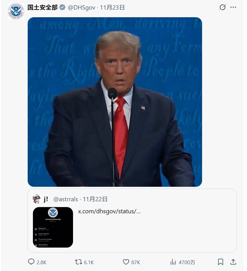 【社交平台X新功能爆出大瓜:】据美国全国广播公司、英国每日邮报等外媒报道,在刚刚过去的周末,社交平台X悄然上线了一项可以查看用户IP属地的新功能。此前这一功能已得到该平台产品主管尼基塔·比尔(Nikita Bier)的预告。当时他宣称,这一功能旨在帮助用户验证所读内容的真实性,并限制“水军”。然而这一功能甫一上线,许多网友惊讶地发现,许多特朗普的“忠实拥趸”或是宣扬“MAGA”(让美国再次伟大)的账号位于海外,例如,一个名为“特朗普是我的总统”的用户,位于马其顿;一个名为“美国优先”的账号位于孟加拉国等等。不仅如此,还有网友扒出,美国国土安全部官方账号的创建地和IP属地均显示为“以色列”,相关截图已在外网广泛流传。这一消息遭到曝光后,许多美国网友痛斥美国政府将“外国实体置于本国之上”。对于网友提问的“一个美国政府部门的官方账号为何显示IP在以色列”,X平台AI大模型Grok生成的回复称:美国国土安全部本身设在美国,但其下属部门美国移民及海关执法局(ICE)在以色列特拉维夫设有国际办事处。账号可能因为登陆位置等原因显示在以色列。随着舆论发酵,这一功能又“突然消失”,引发了关于“X”平台撤下该功能是为了平息争议的质疑。尼基塔·比尔当地时间11月23日发布声明称,“该功能被关闭,是因为在极少数旧账户中,账户注册国家的信息不正确。这是由于IP地址段随时间推移发生了变化所致。”尽管在声明中并未提及美国国土安全部,但他随后评论中回复称有关美国国土安全部账号位于以色列的消息是“假新闻”。他宣称,“任何政府官方账号在任何时候都没有提供过位置信息。此外,美国国土安全部的账号自创建以来只显示来自美国的IP。”另一方面,美国国土安全部起初发布了一张特朗普看起来很震惊的“表情包”式图片,试图“打马虎眼”。但随着舆论不断发酵,该账号后续又发文称,“美国国土安全部账号一直以来都在美国运营。截图很容易伪造,视频也很容易篡改。感谢对此事的关注。”截至当地时间11月23日,显示IP属地的功能又一次上线。重新上线后,美国国土安全部账号的IP属地显示为“美国”。值得注意的是,外媒报道称,美国国土安全部似乎是唯一显示所在地的灰标政府账户,因为其余美国政府账户现在只显示账户创建日期和验证日期。