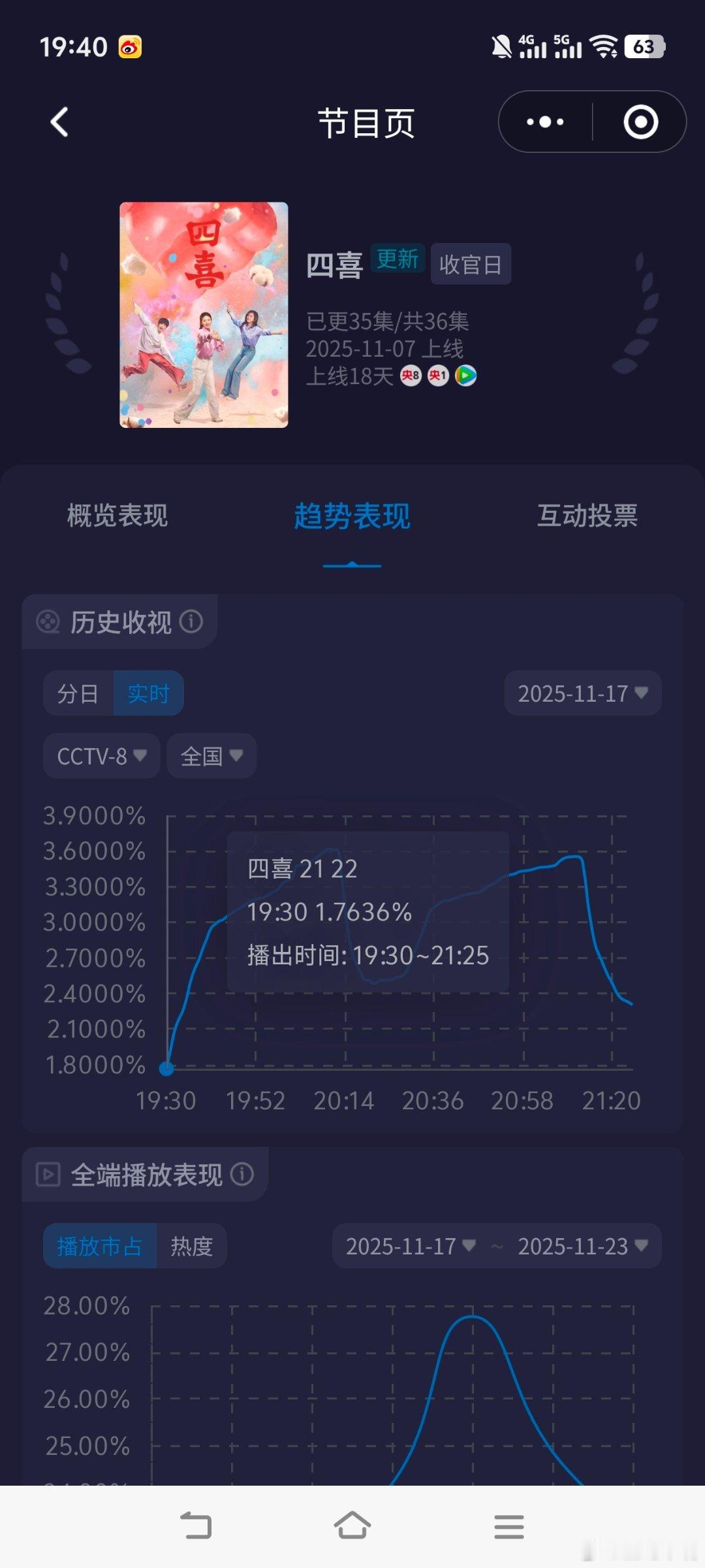 截止11月24日,2025年央八傍晚档(18:30)收视小结:11月17日《绽放吧百合》酷云峰值2.3115(今年最高峰值),黄金档《四喜》起点1.7636!11月24日《生万物》酷云峰值2.1715,黄金档《四喜》酷云起点1.8388(今年最高起点)