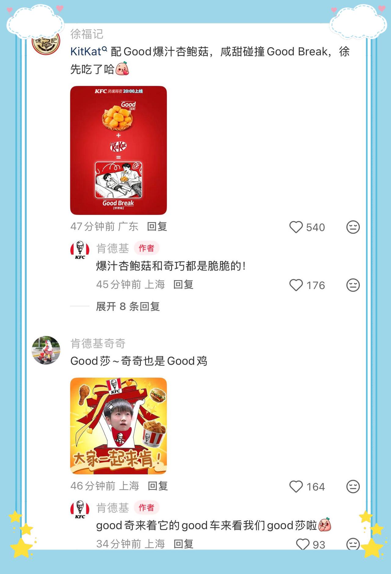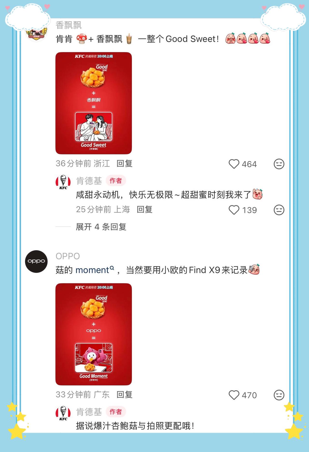 太可爱了,孙颖莎代言的品牌今天又在肯德基团建了。 肯德基年会,宣布和孙颖莎长情陪伴,一直到下个奥运会都在一起。 今天,莎莎代言的各品牌方又开始在肯德基评论区团建了, 茹,和莎莎代言的任何东西都可以搭配。 keep,oppo,徐福记,维达,香飘飘,高露洁,妮维雅都来了, 见识过他们的团建, 他们还有一个自己的群, 稍等肯定各品牌方都来。 都很可爱,大家说是因为代言人可爱, 所以大家都可爱吗, 可能是吧, 另外可以肯定的是,代言人的格局,也会把品牌带到更高!