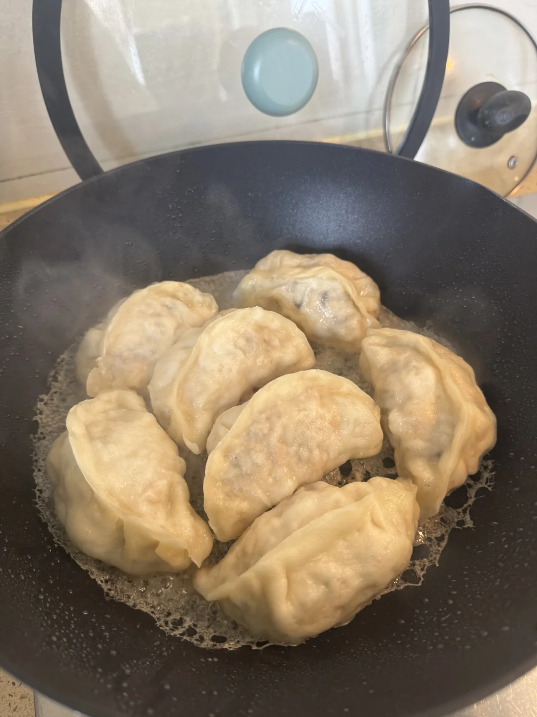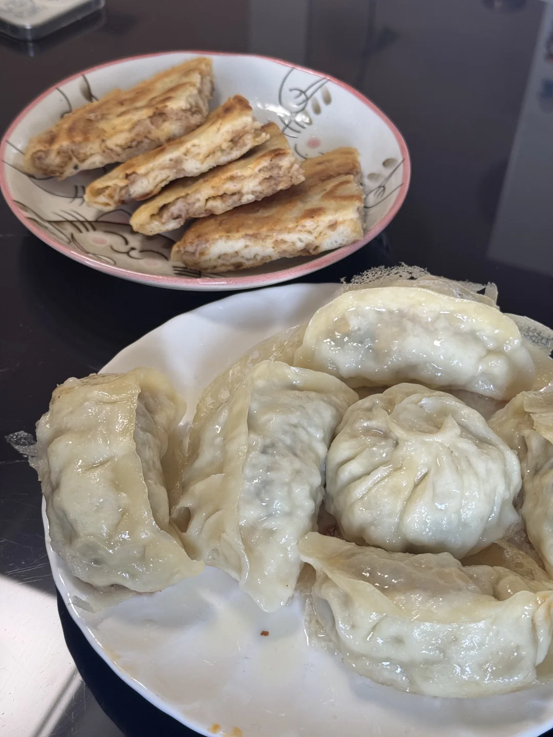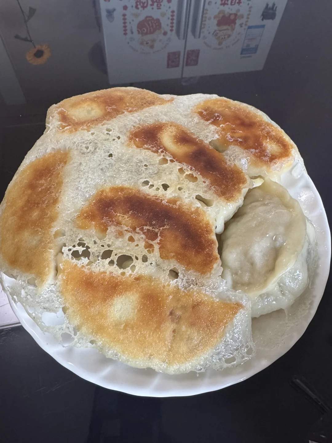 今天做了三鲜水煎饺,酒酿鸡蛋小圆子,剩下的肉馅儿煎了两张麻辣肉饼,备着明天的早餐啦! 话说这个三鲜水煎饺太好吃了,墙裂推荐给要娃儿备餐的宝妈们: 馅儿:三个鸡蛋炒熟打散,肉馅加葱姜花椒水、盐、糖、生抽、十三香拌匀,一袋盒🐴青虾滑,一把木耳提前泡好焯水后切碎。 饺皮:300g面粉+3g酵母+一小勺糖+170g水,发酵。 包成大饺子后,室温醒发20分钟,然后热锅凉油放入饺子,底部焦黄后导入一碗淀粉水,盖盖中小火煎到水分基本收干,开盖沿着锅边再淋入少许油,煎到焦黄香脆就可以出锅啦!