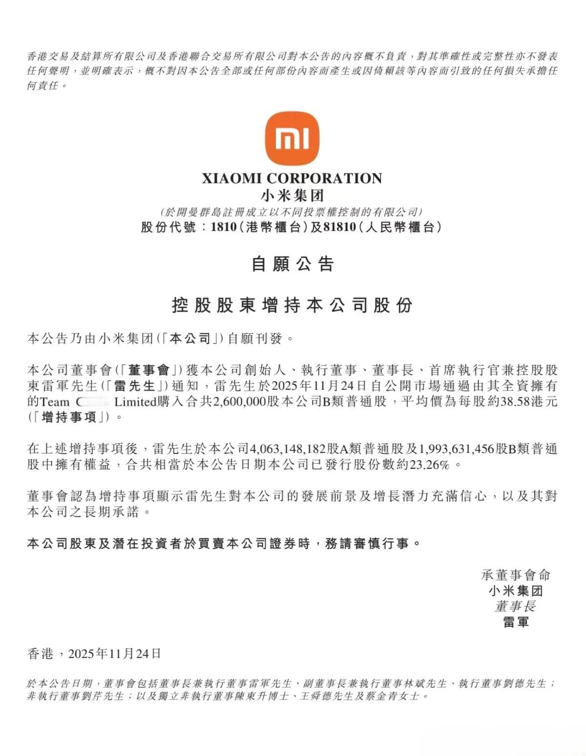 雷军今天增持小米集团260万股,平均每股是约38.58港元,至此雷军持股比例增加