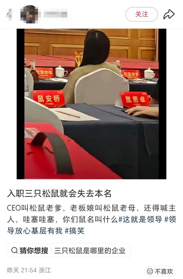 日前,有网友在社交平台发帖称,在入职三只松鼠后会失去本名,因为员工会将自己的名字改为“鼠某某”。据该网友发布的照片显示,在一会议现场上,每个座位都摆放着以“鼠”字开头的名牌,如“松鼠老爹”“松鼠老母”等。据介绍,“松鼠老爹”即公司创始人章燎原。