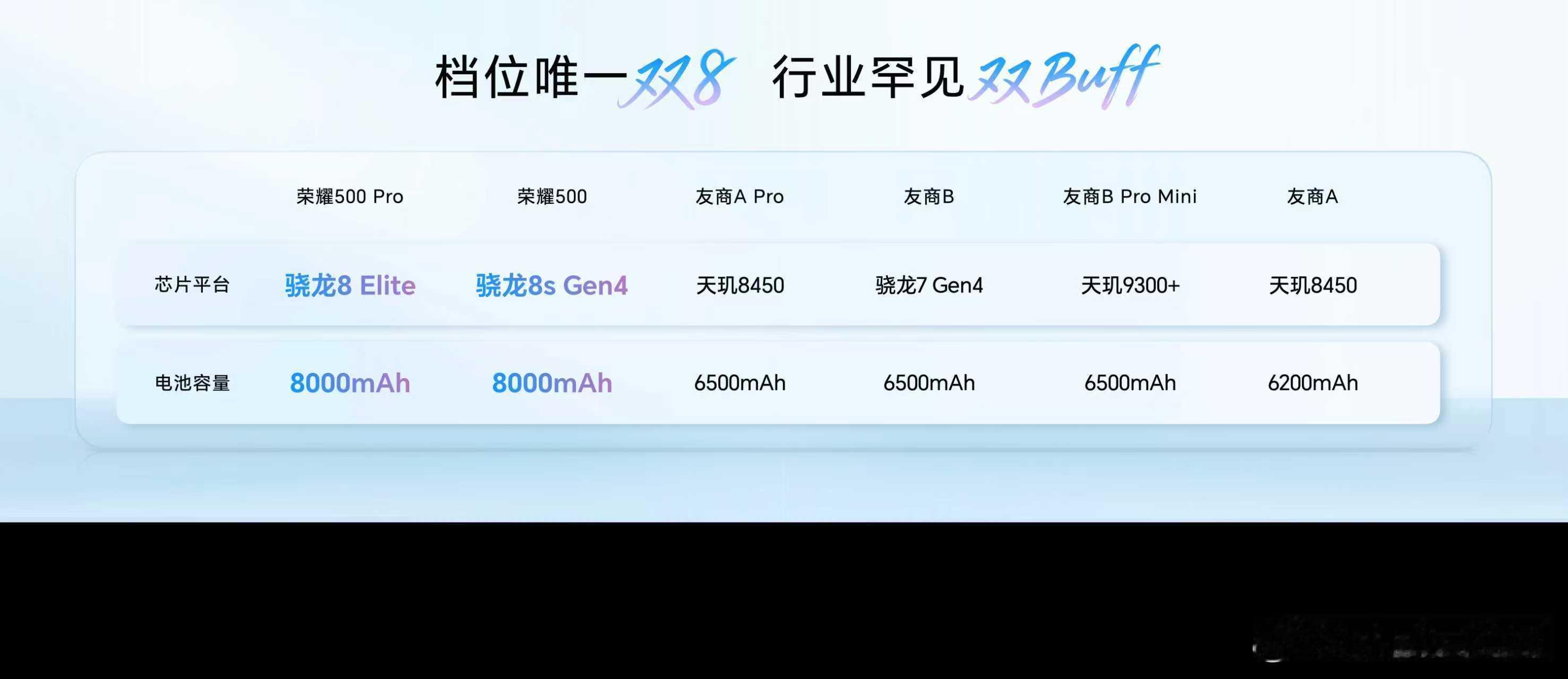 系列超大电池,超久续航!荣耀500全系搭载8000mAh青海湖大电池,并搭载旗舰